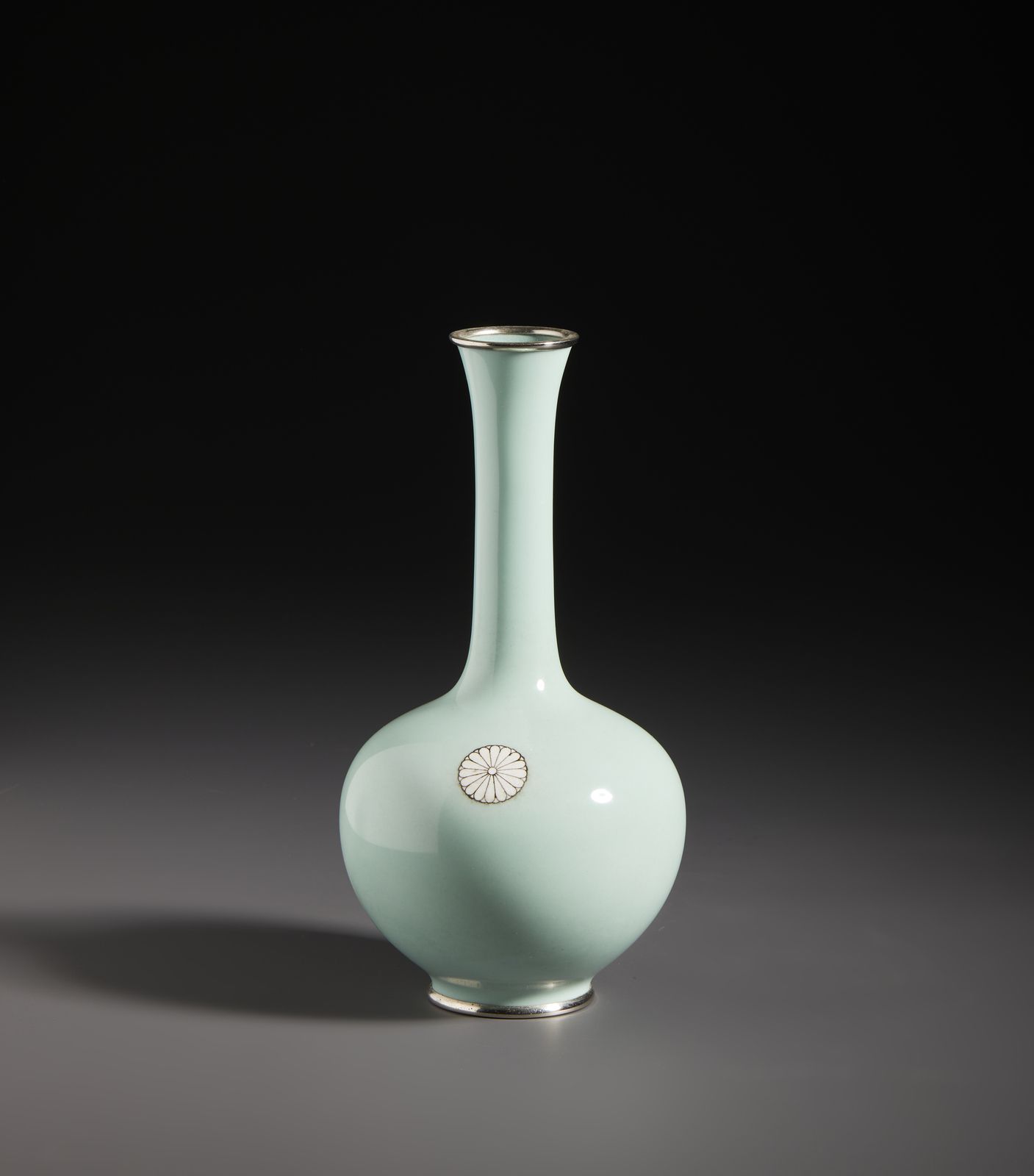 Raffinato vaso in smalto cloisonné dal colore verde pallido decorato centralmente [..]