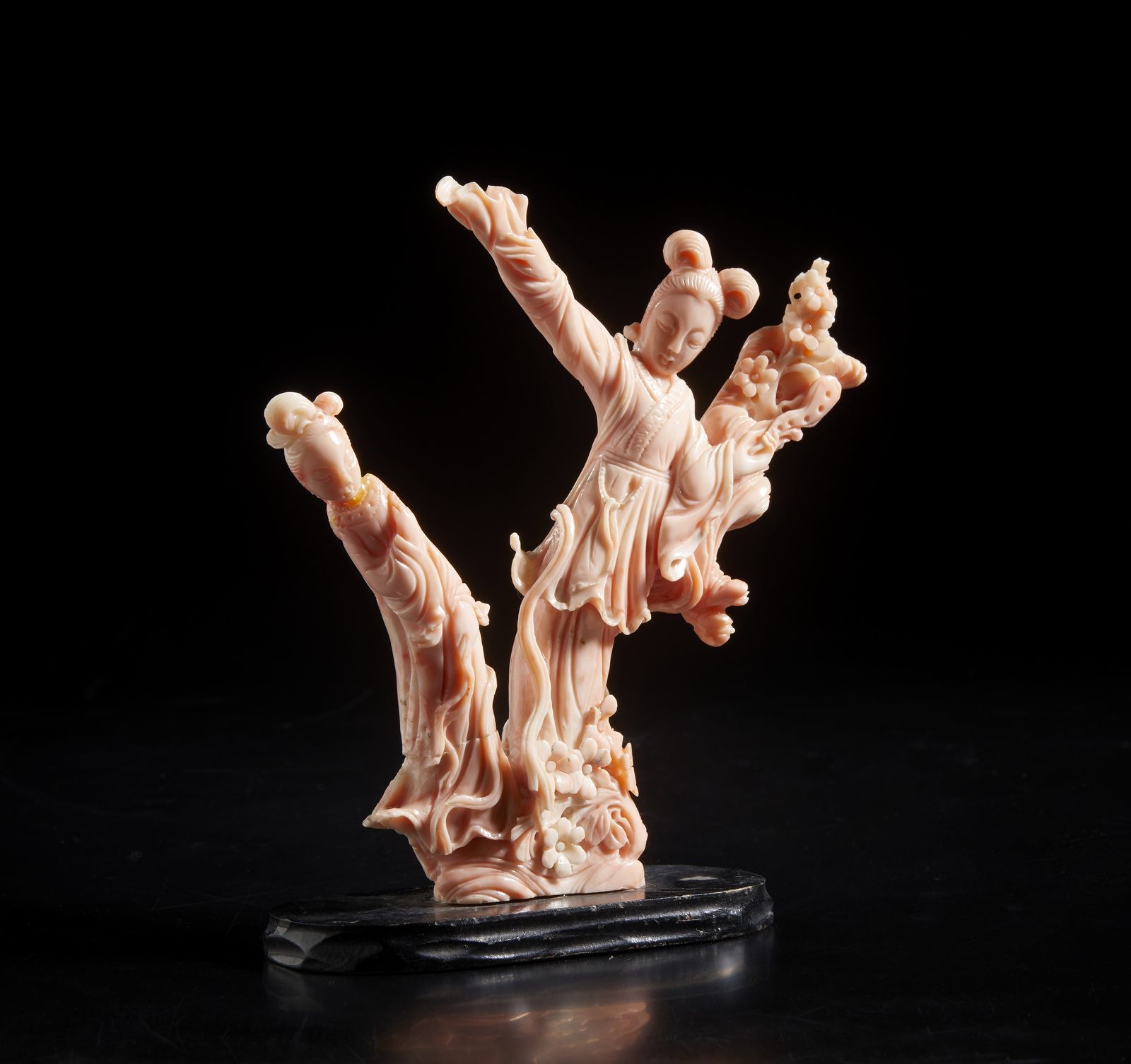 Ramo di corallo rosa intagliato con due dame Cina, XX secolo