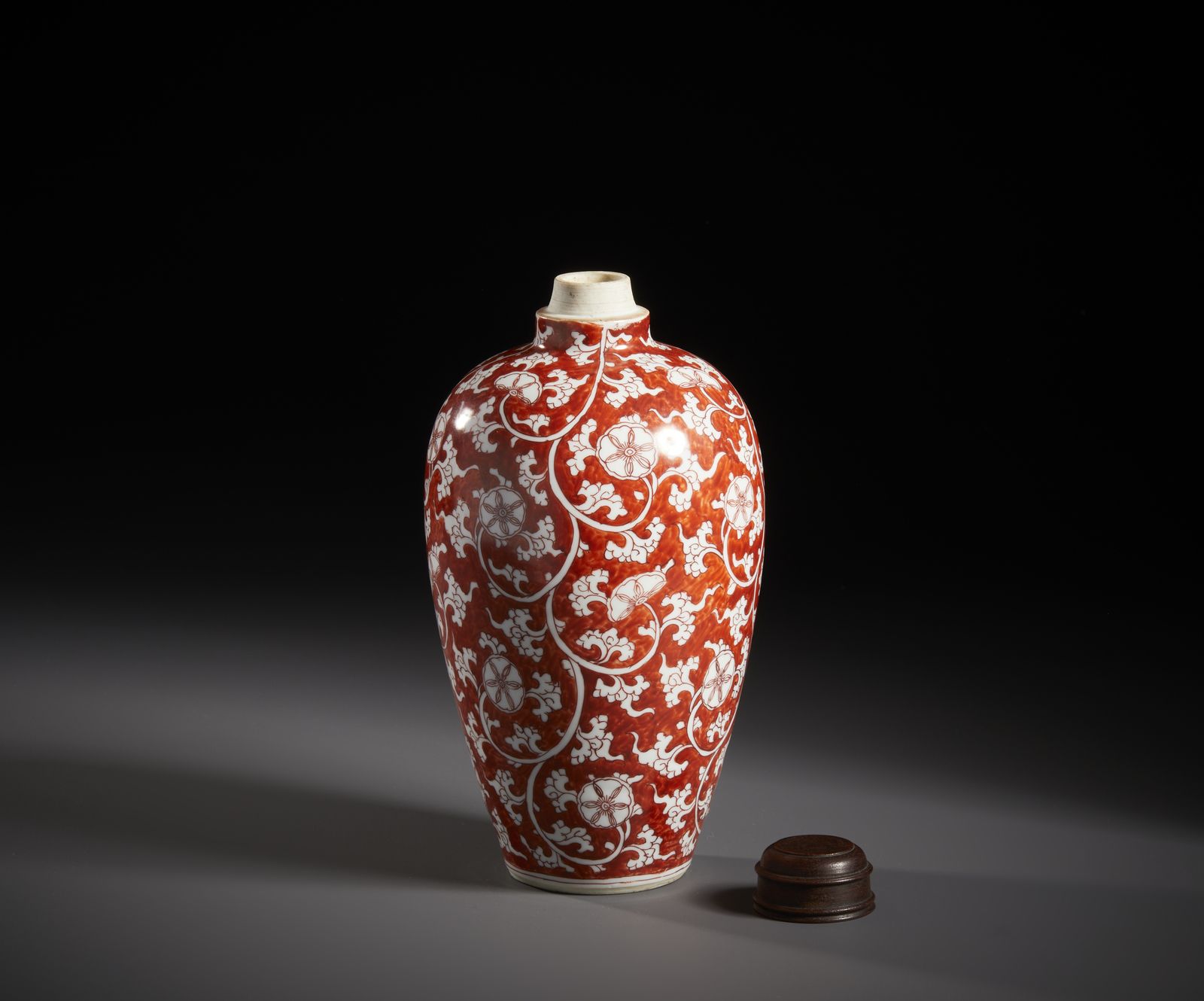 Rara giara in porcellana dal corpo elegantemente allungato dipinta in rosso ferro. [..]