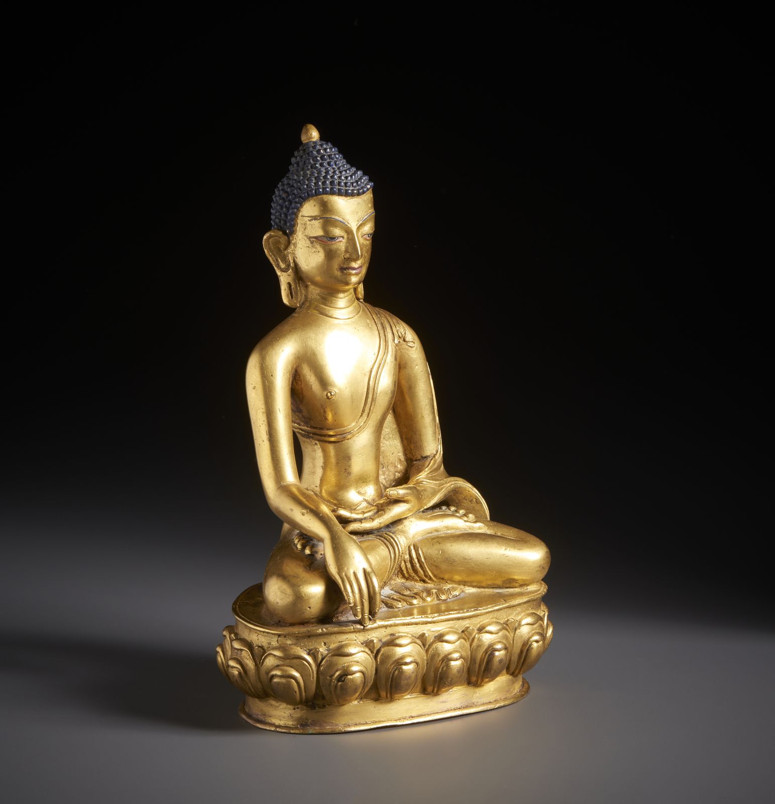Scultura in bronzo dorato raffigurante Buddha Sakyamuni elegantemente seduto su [..]