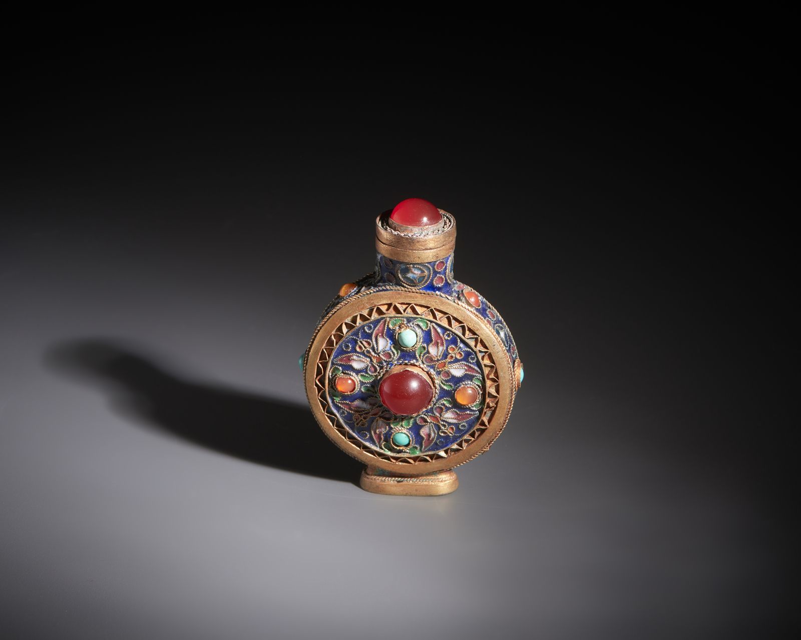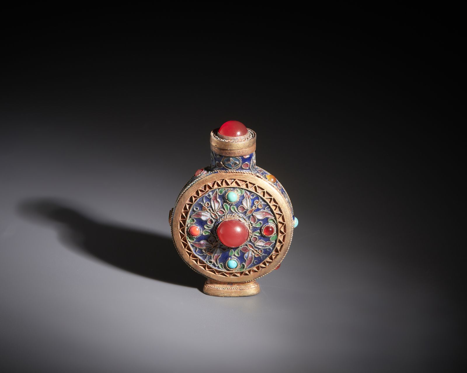 Snuff bottle in metallo dorato decorata con smalti policromi e pietre semipreziose.Cina, [..]