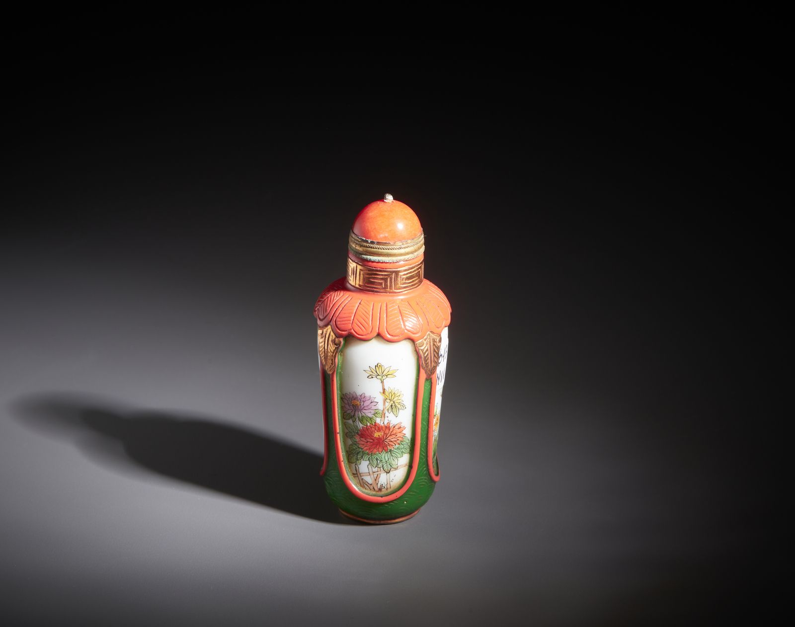 Snuff bottle in vetro di Pechino intagliato con riserve rosse e verdi al cui interno [..]