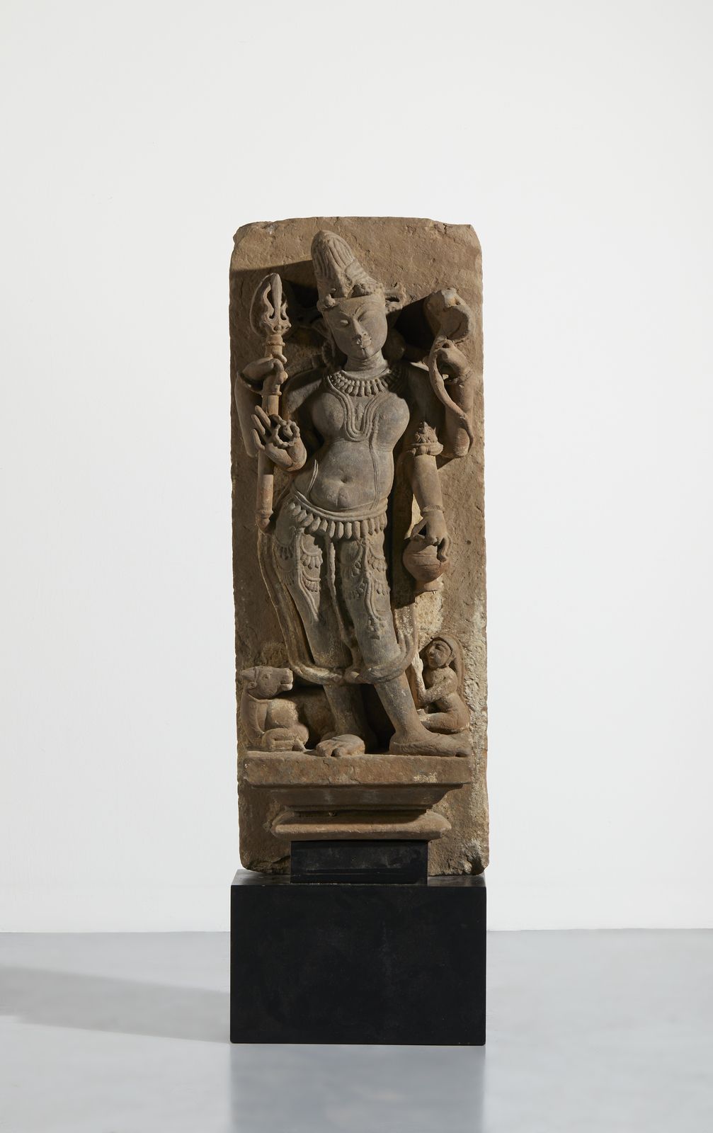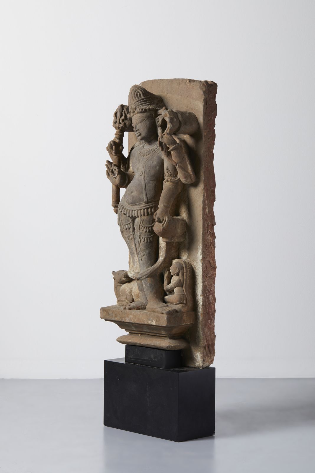 La stele di forma rettangolare è scolpita ad altorilievo con Shiva in piedi in tribhanga su di un piedistallo sobriamente sagomato, le mani in primo piano reggono akshamala e kalasha mentre quelle superiori trisula e naga. Il corpo sinuoso è coperto da un dhoti decorato con nappe e gioielli. Il viso dall'espressione soave è caratterizzato da grandi occhi a mandorla, i lobi delle orecchie allungati sorreggono grandi orecchini e il volto è incorniciato dalla bellissima acconciatura jatamakuta. Ai piedi della divinità il fedele toro e un devoto adoratore.Provenienza: Collezione privata italiana. Acquistata da Christie' s Amsterdam rif. Live Auction 2687, 18-Apr-2005 Lotto N° 48. Lotto non esportabile, disponibile solo per utenti residenti in Italia.