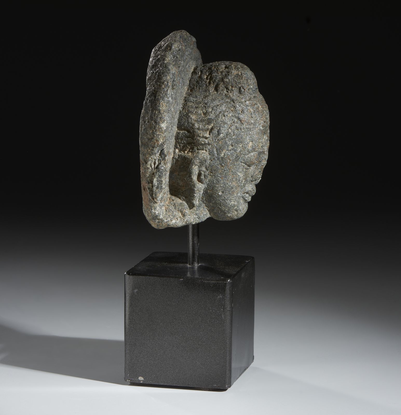 Testa di Buddha in scisto. Stile Gandhara.