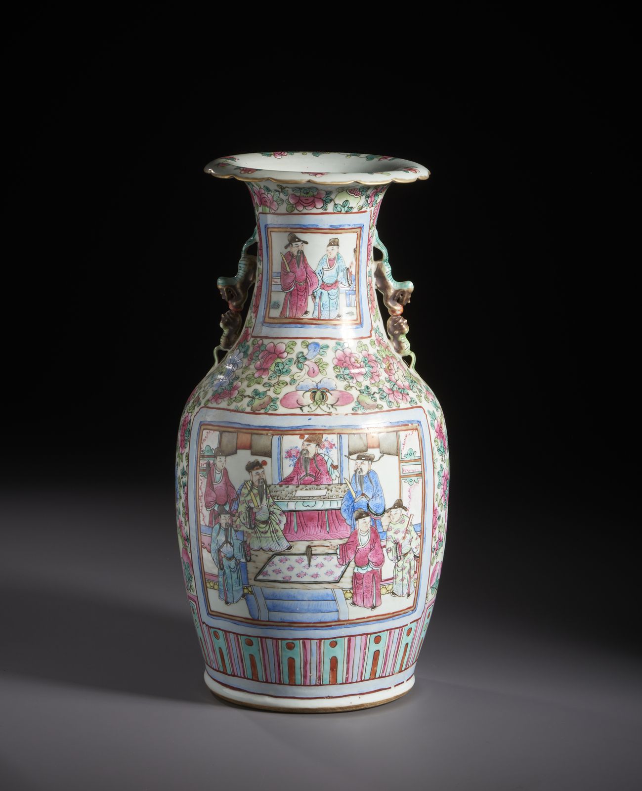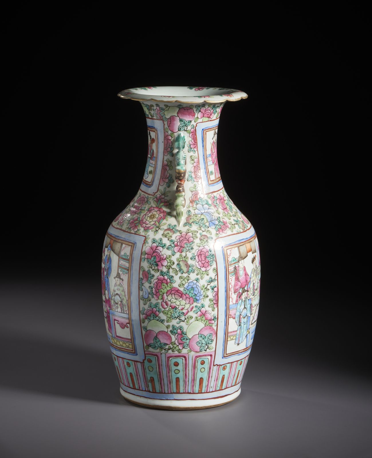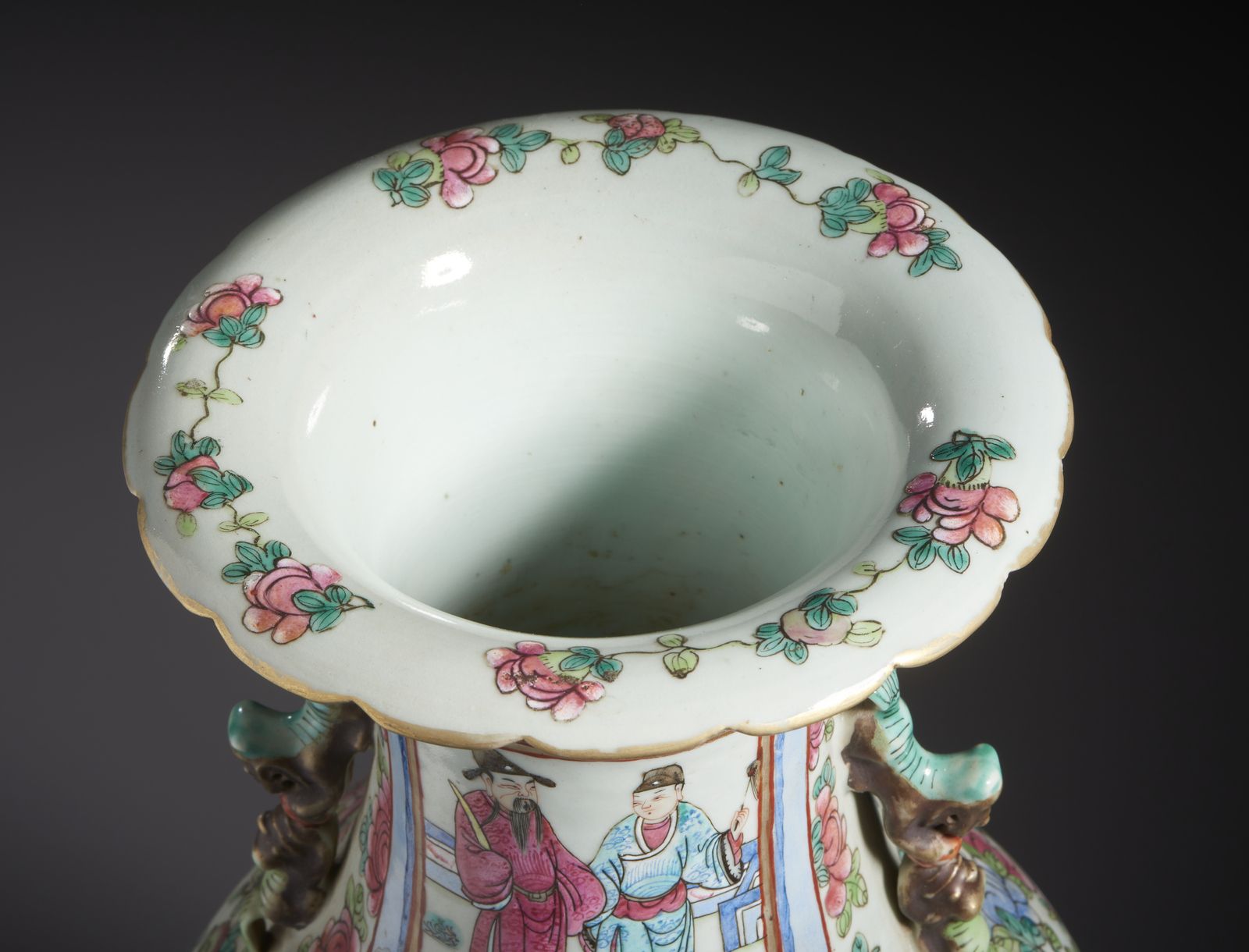 Vaso in porcellana abilmente smaltato nei colori della famiglia rosa, stile “Canton”. [..]