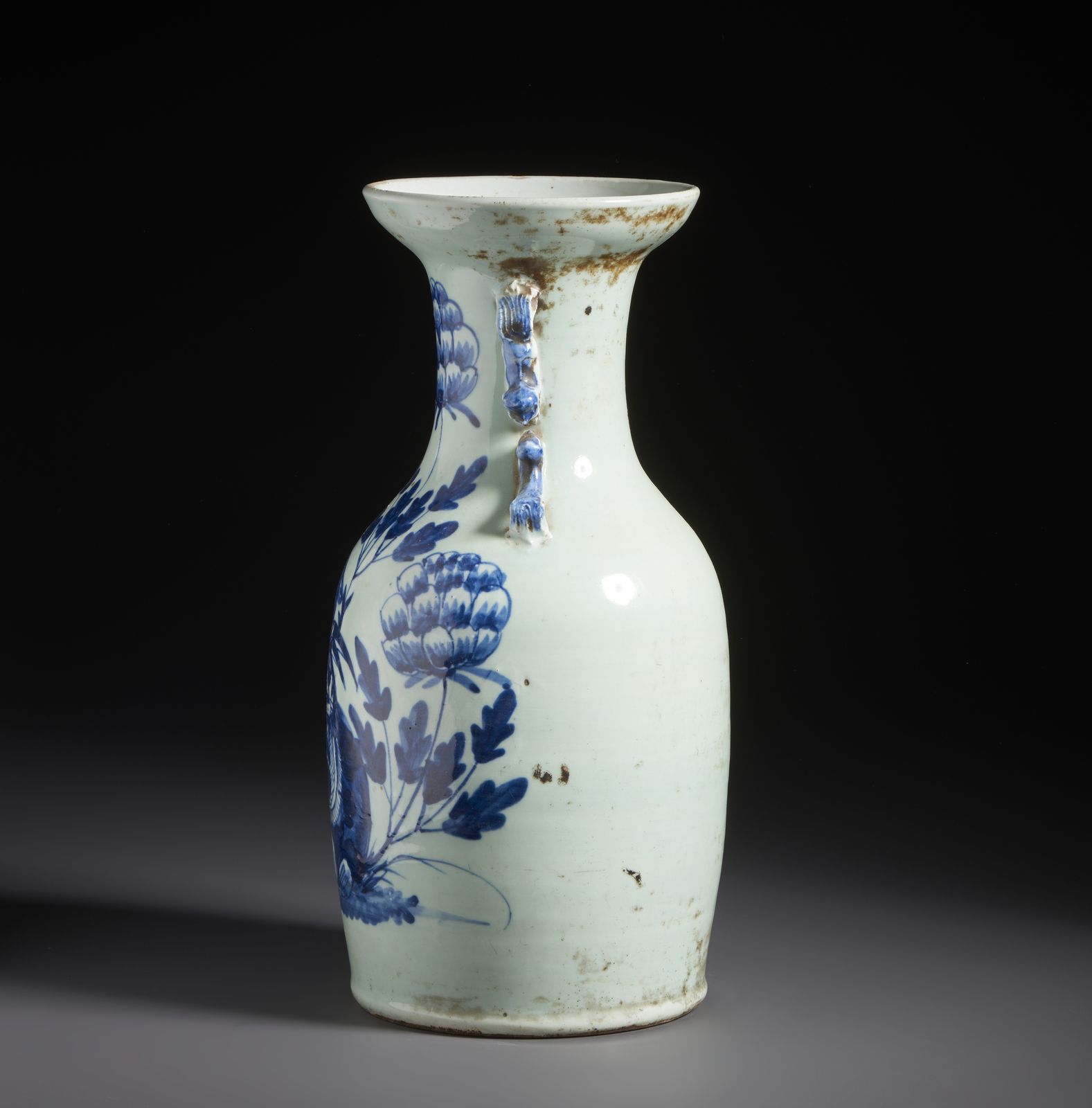Vaso in porcellana bianca e blu dalla forma a balaustra dipinto con fenice tra fiori.Cina, [..]