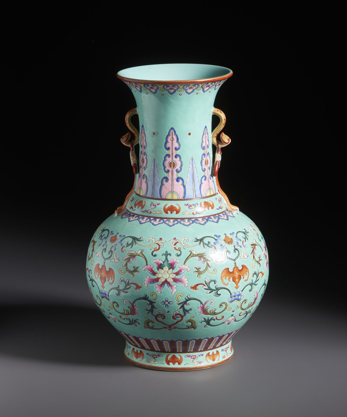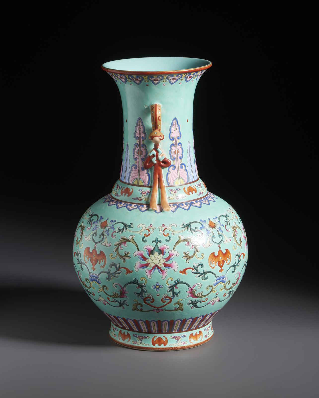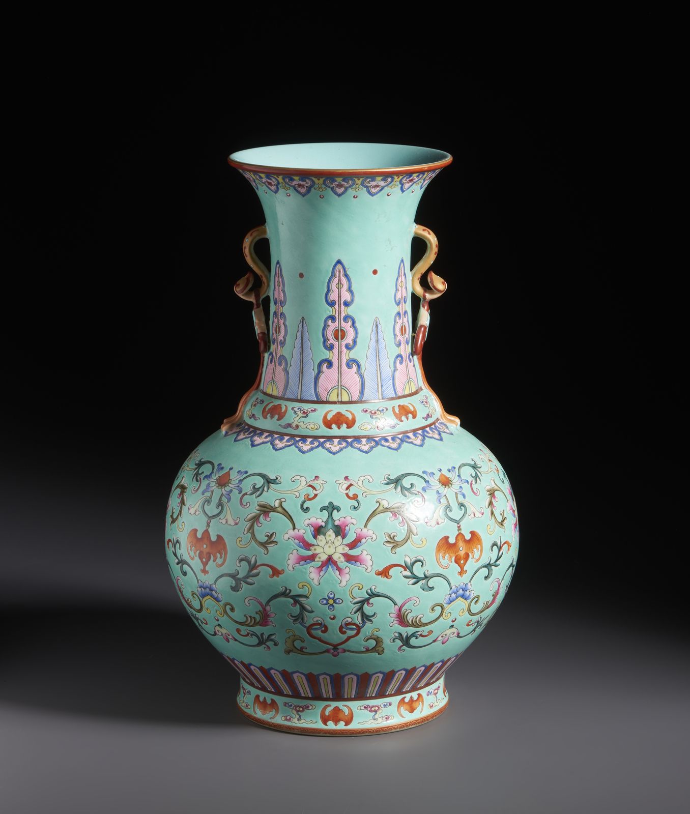 Due manici a forma di scettro ruyi dipinti in rosso ferro e oro sono applicati al collo del vaso.Reca il marchio apocrifo di Qianlong.