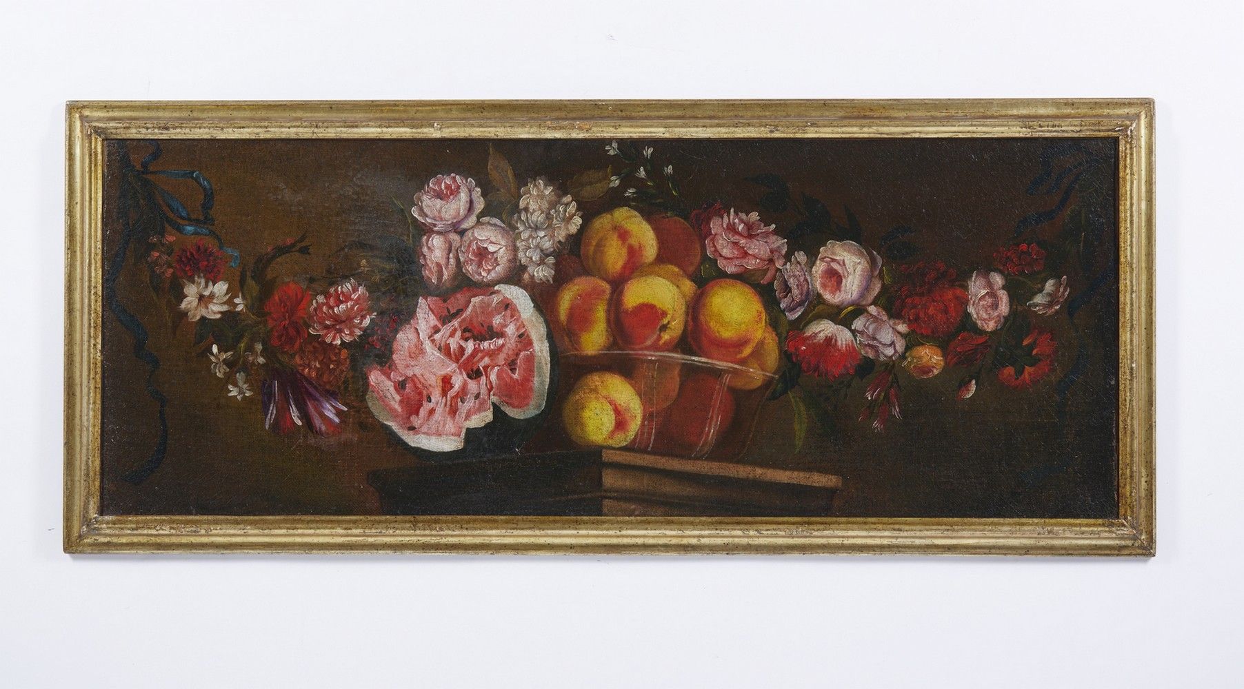 Attribuito a. Natura morta di fiori con anguria e pesche