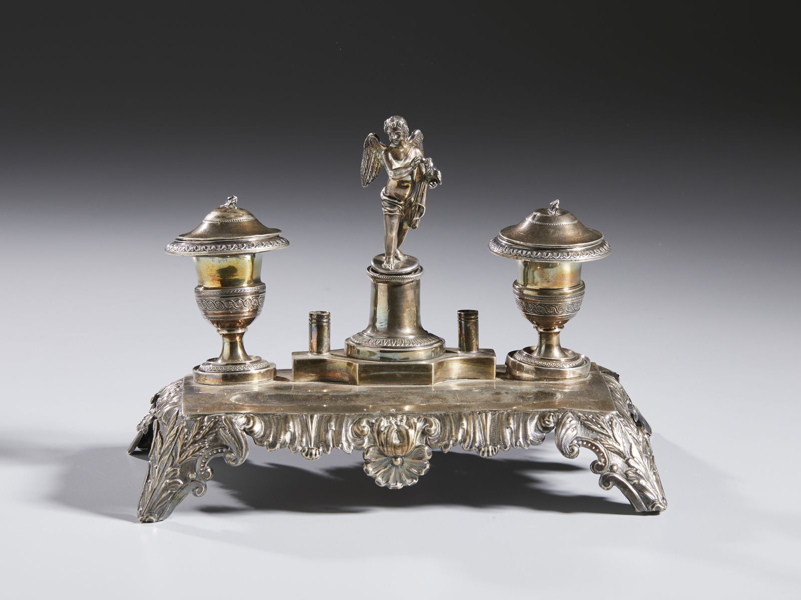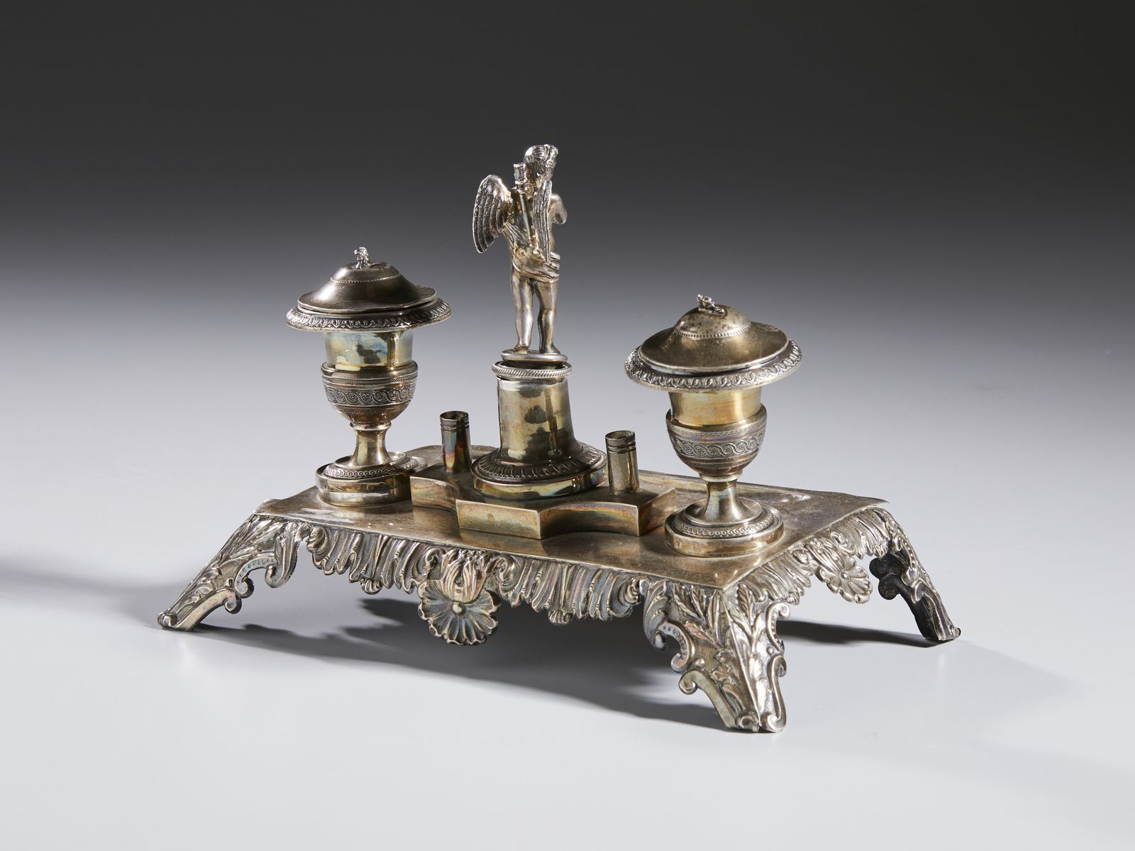 Calamaio in argento sbalzato, base poggiante su quattro piedini a decori fitomorfi, [..]