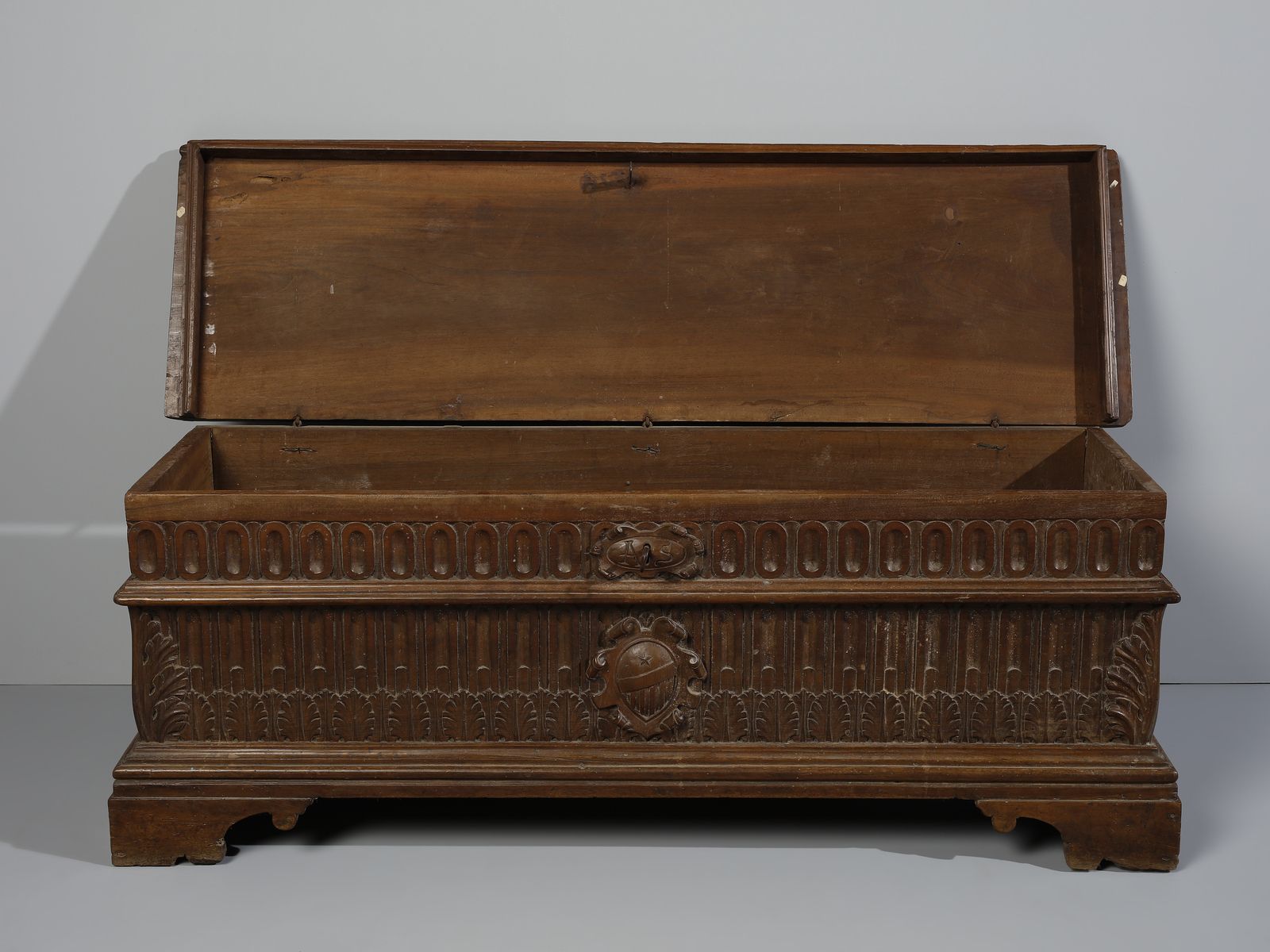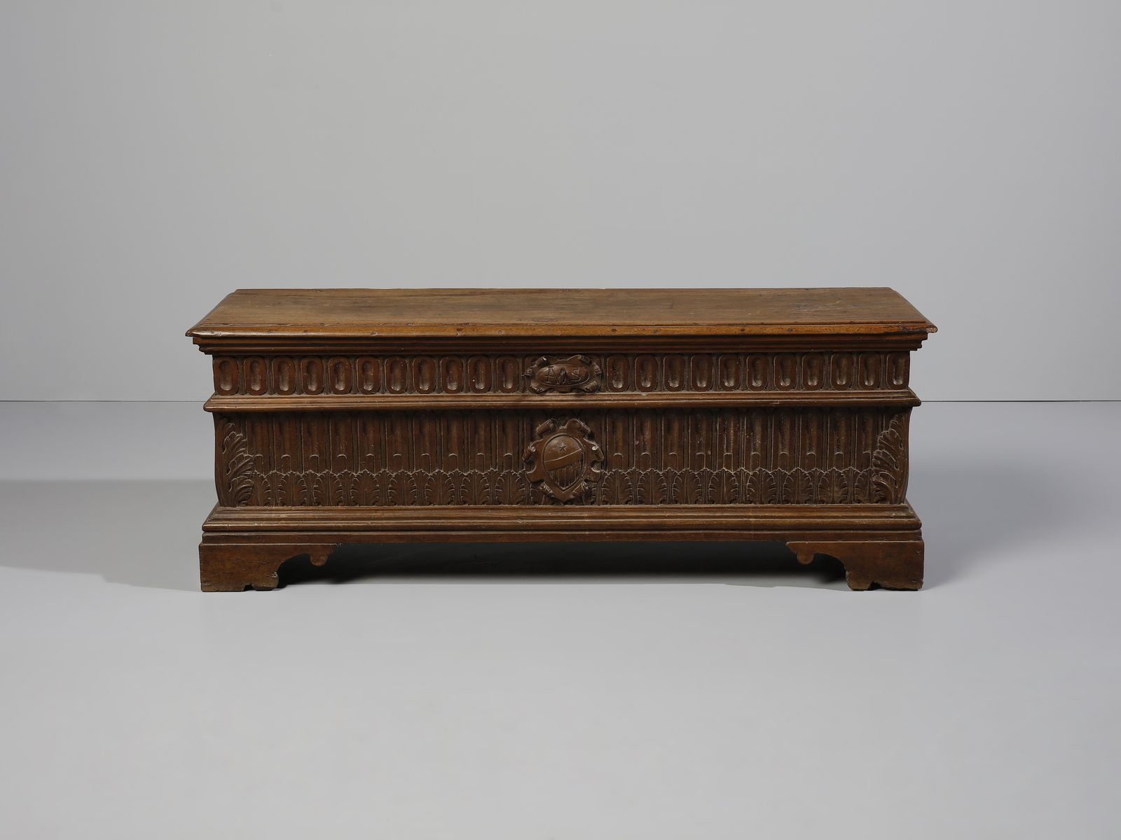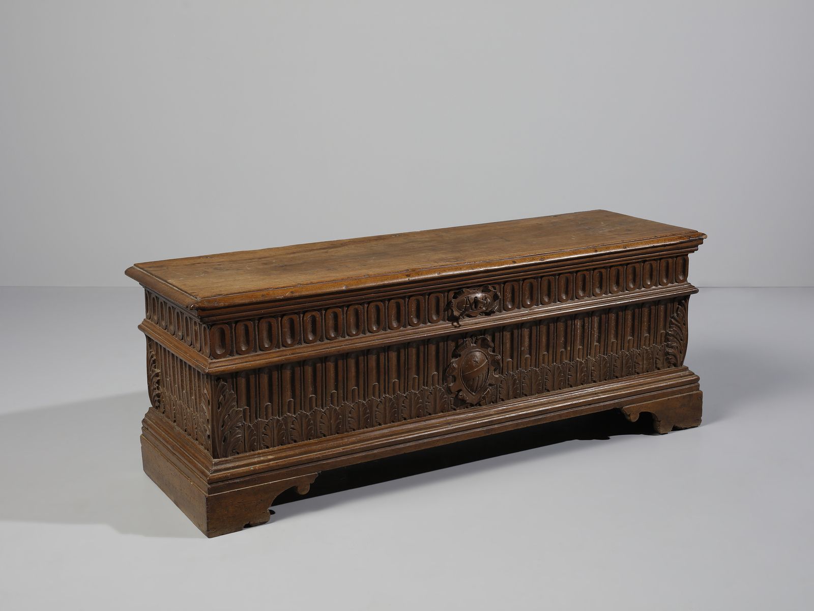 Cassapanca in noce intagliata a motivi baccellati e centrata da stemma sul fronte, [..]