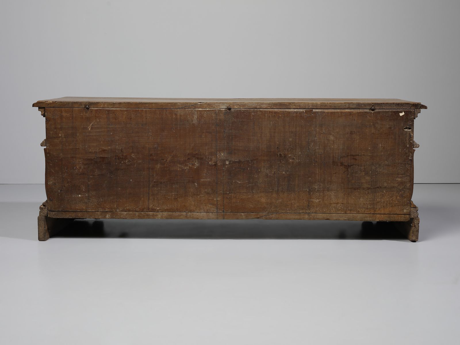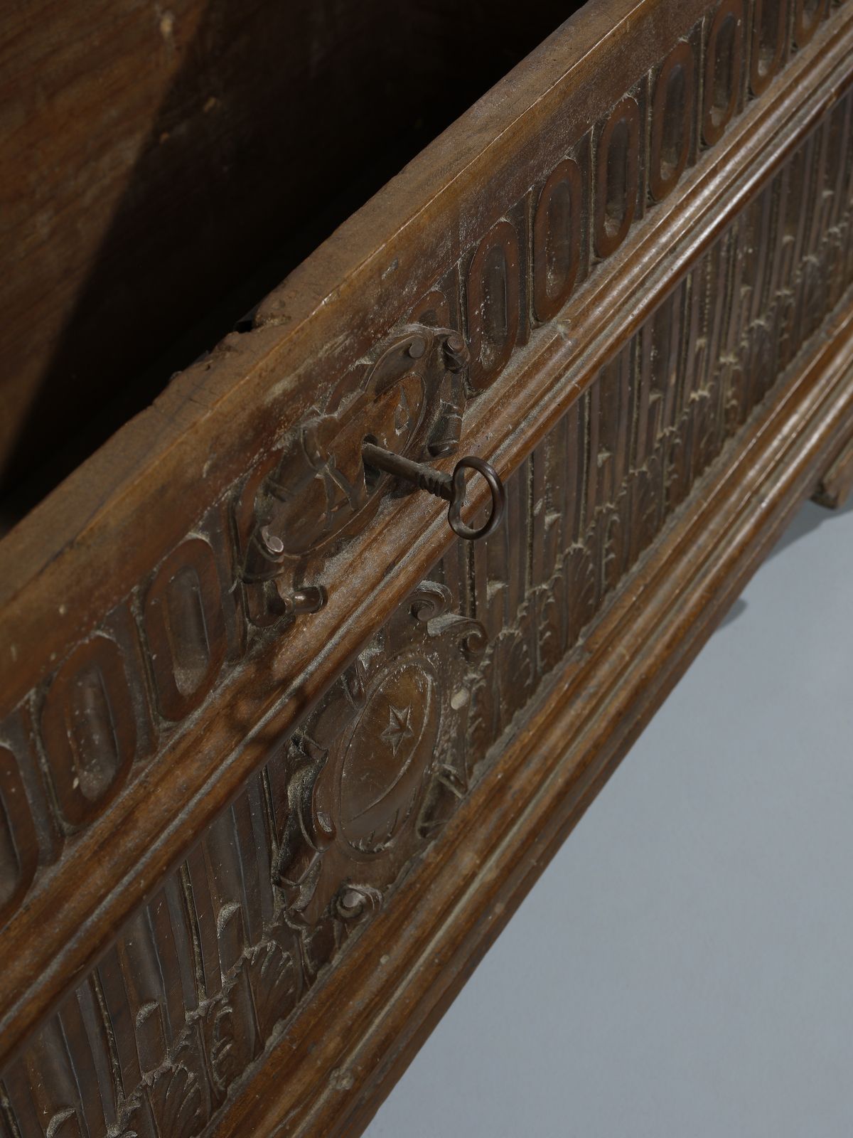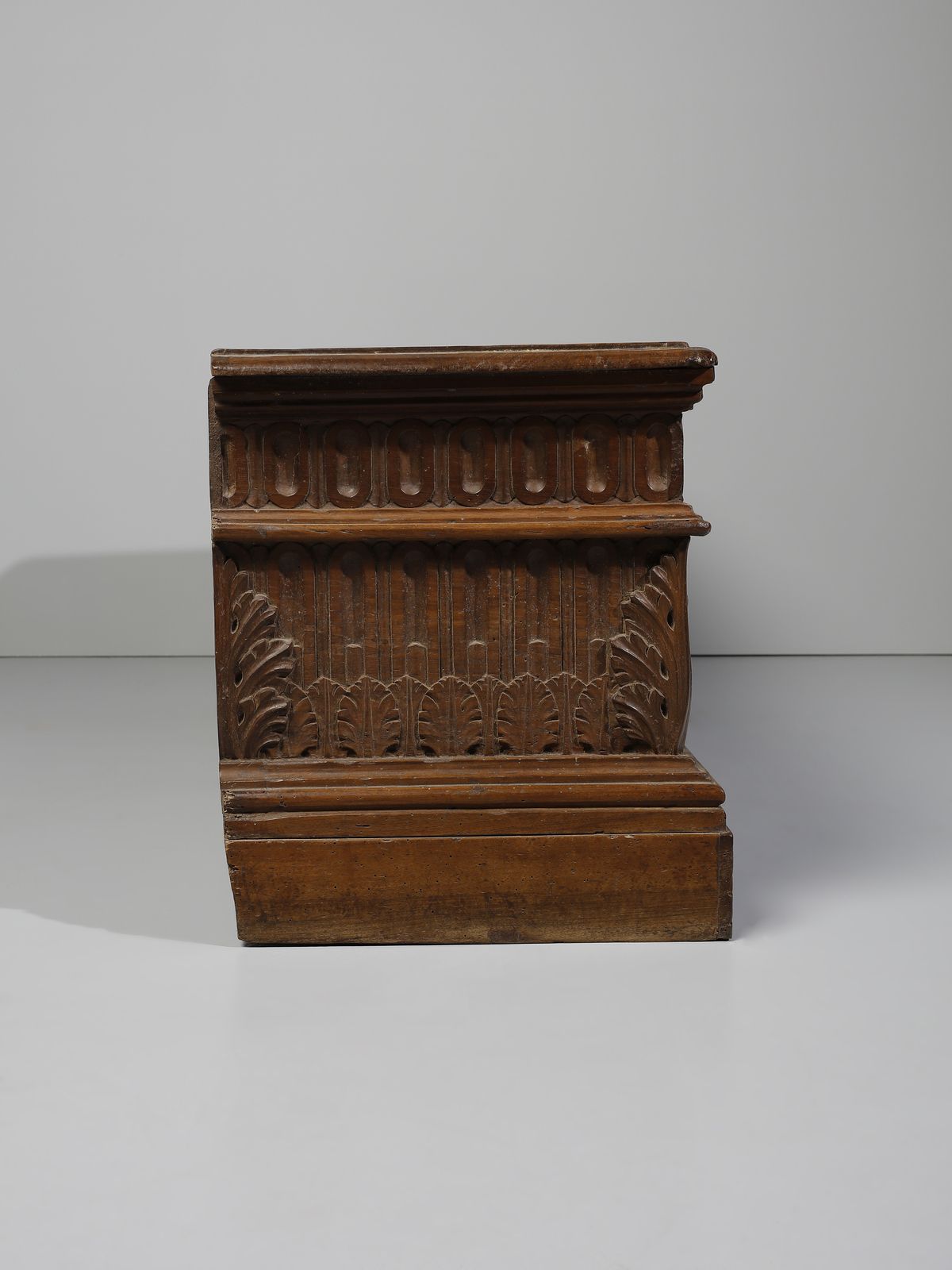 Cassapanca in noce intagliata a motivi baccellati e centrata da stemma sul fronte, [..]