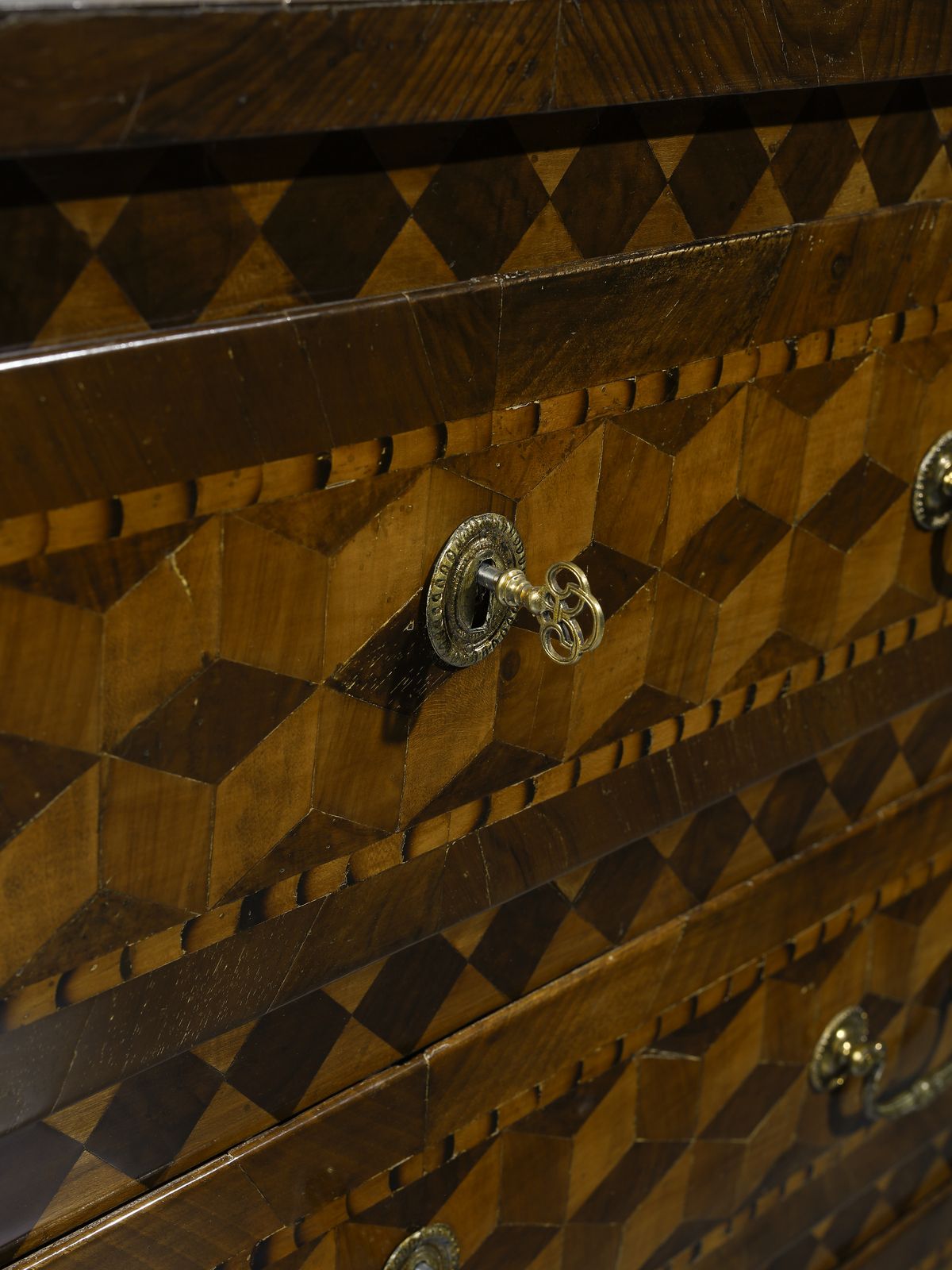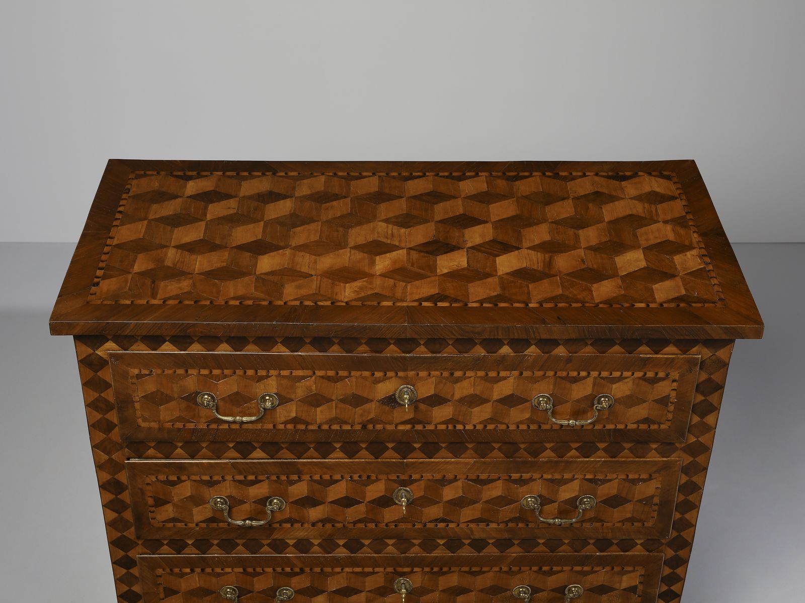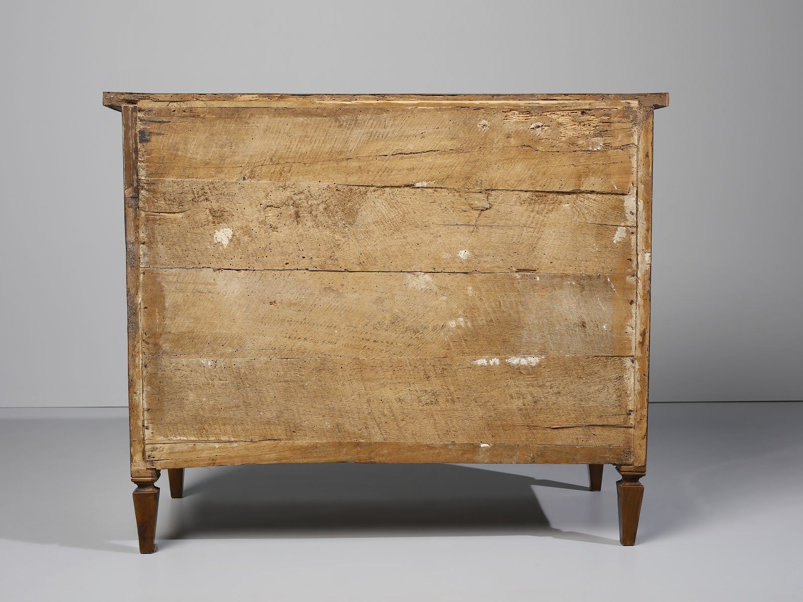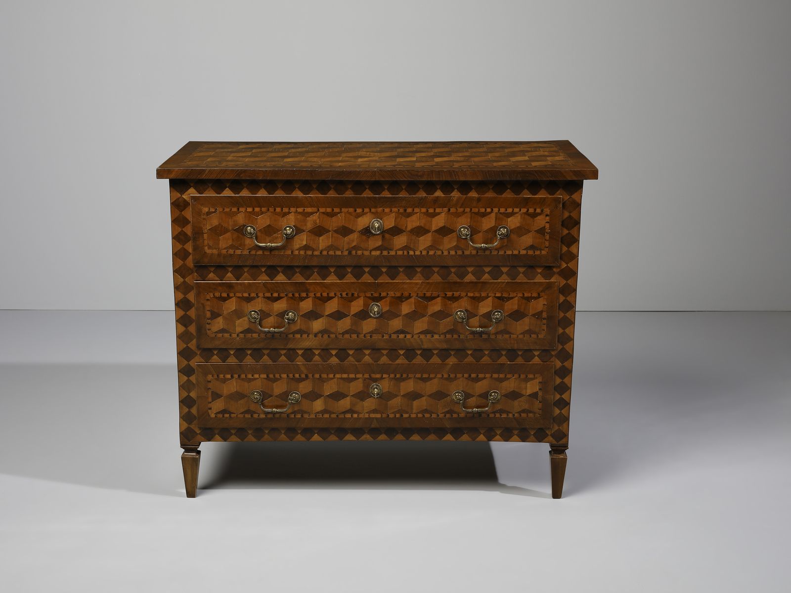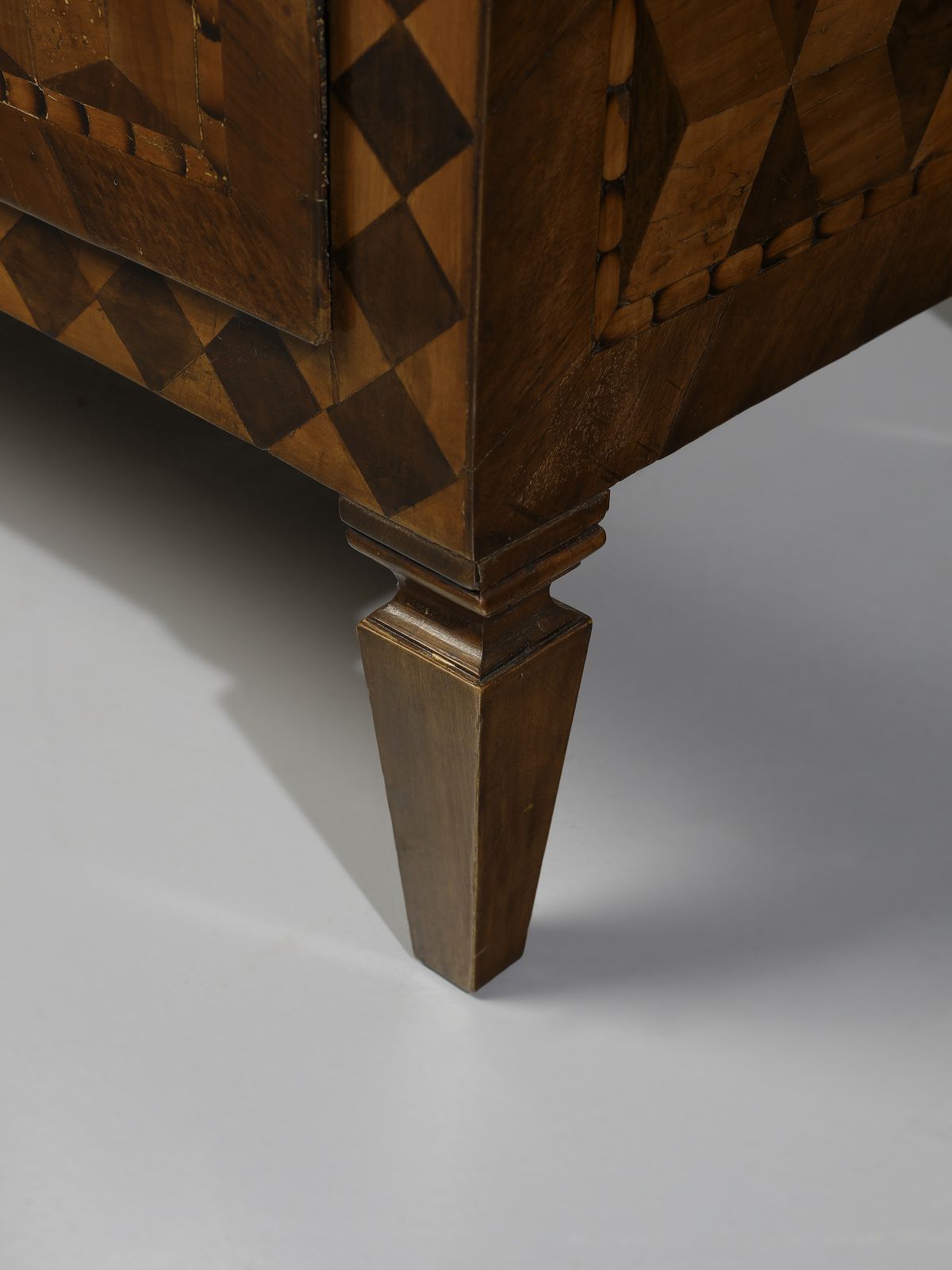 Cassettone lastronato e intarsiato a marqueterie, tre cassetti sul fronte, gambe [..]