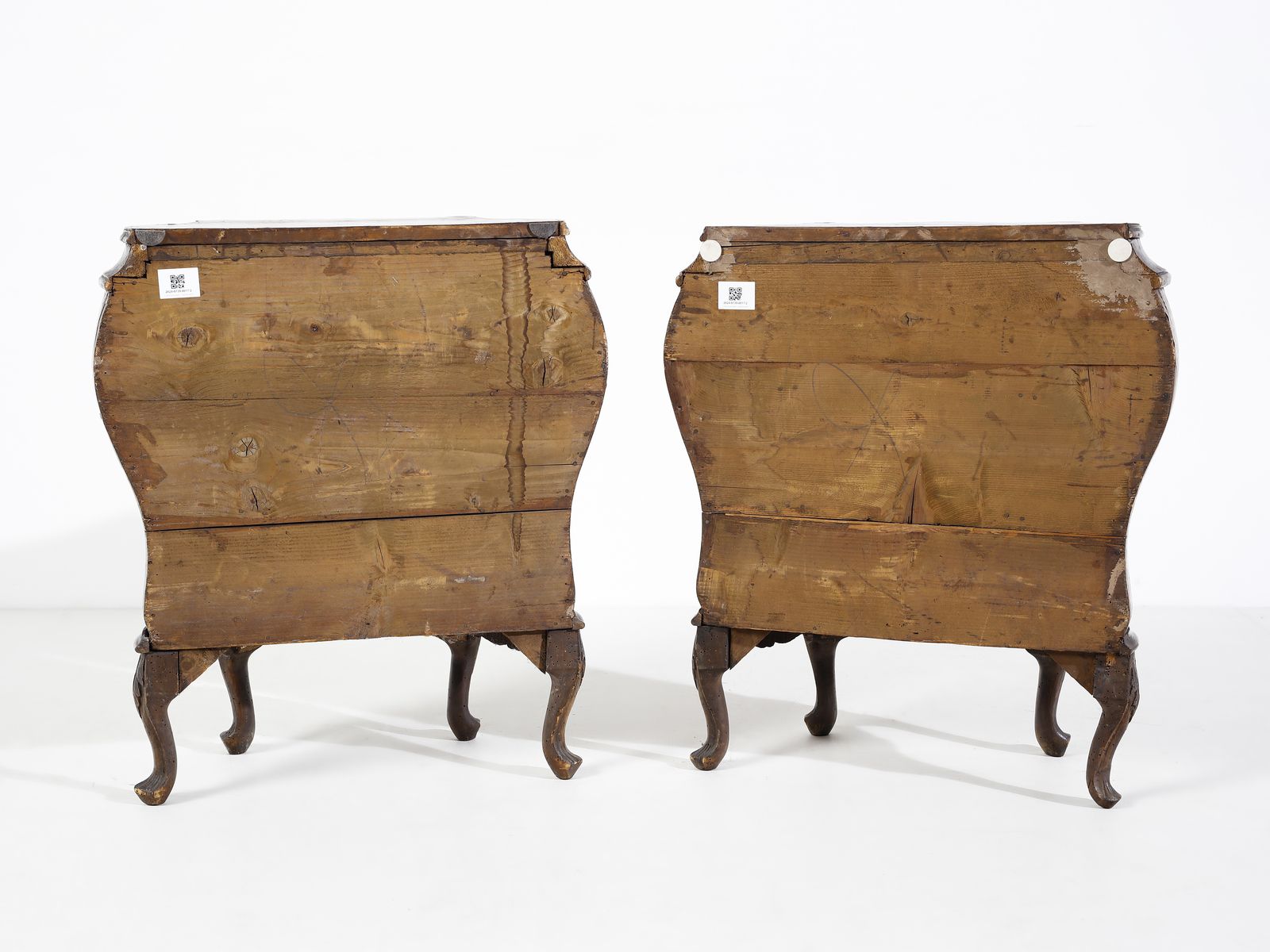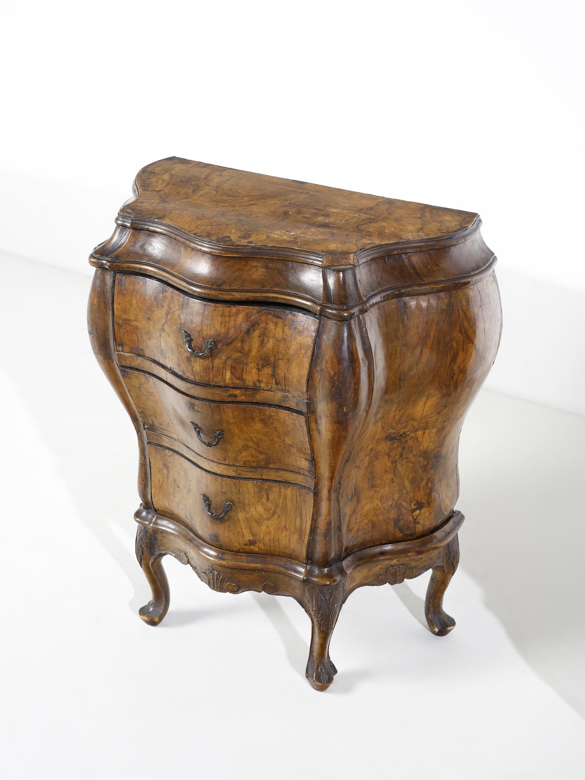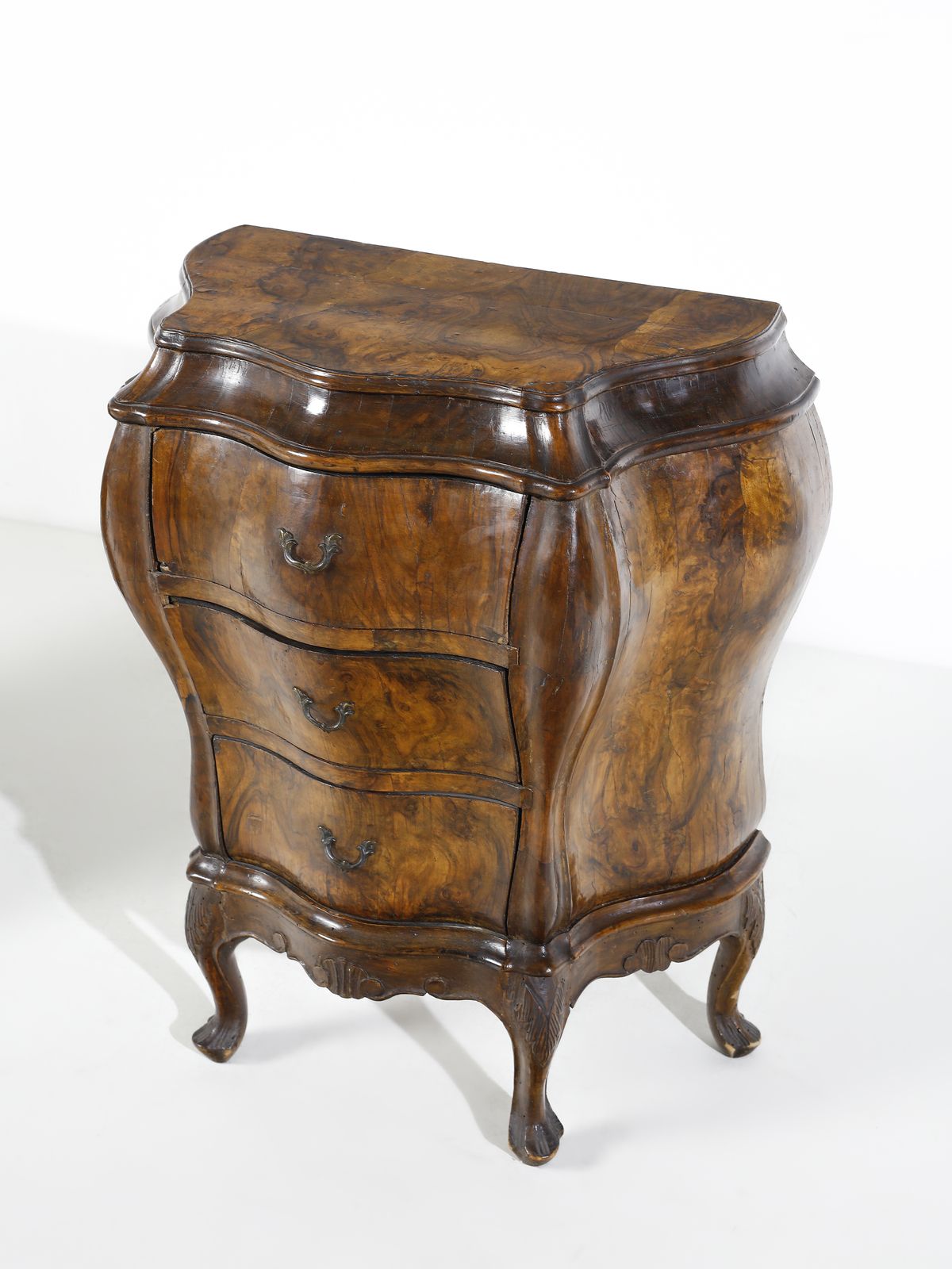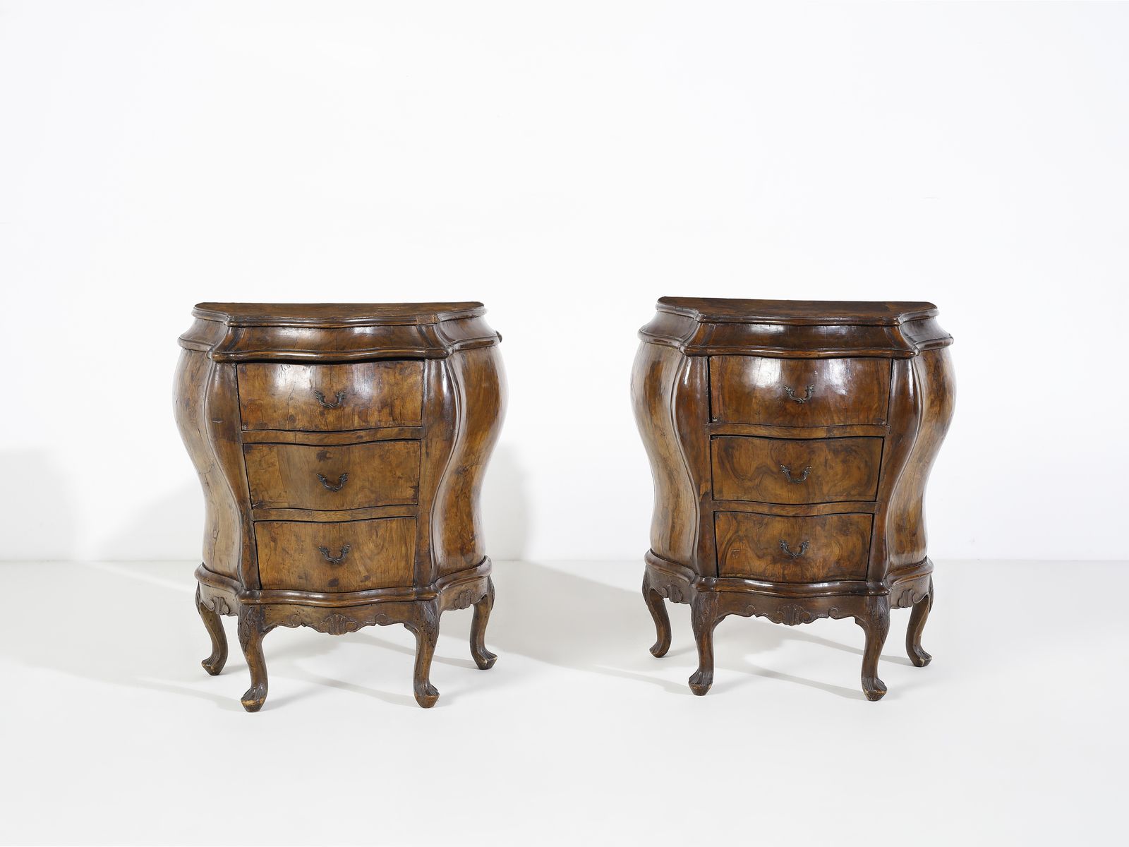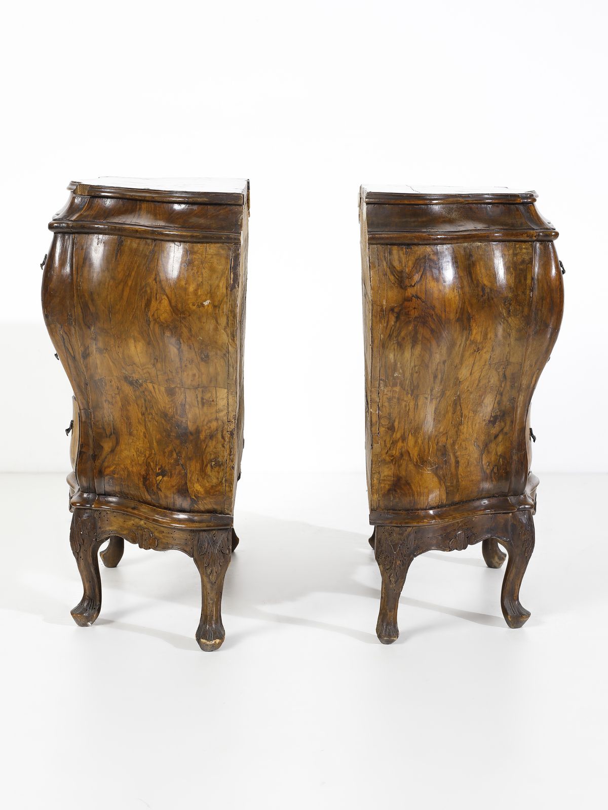 Coppia di comodini in noce e radica di noce, di forma bombata con piano sagomato, [..]