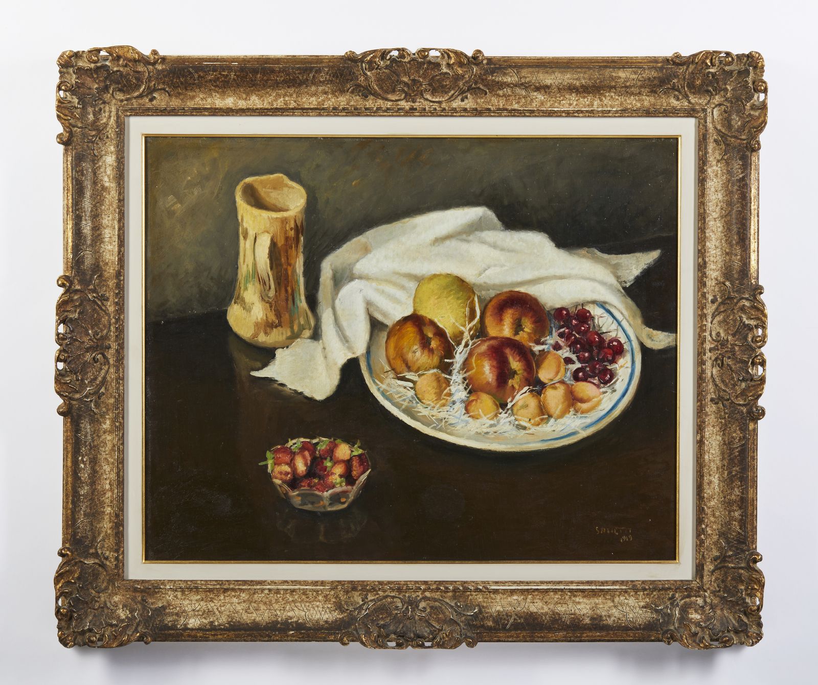 Natura morta con pesche, albicocche, uva, fragole e brocca