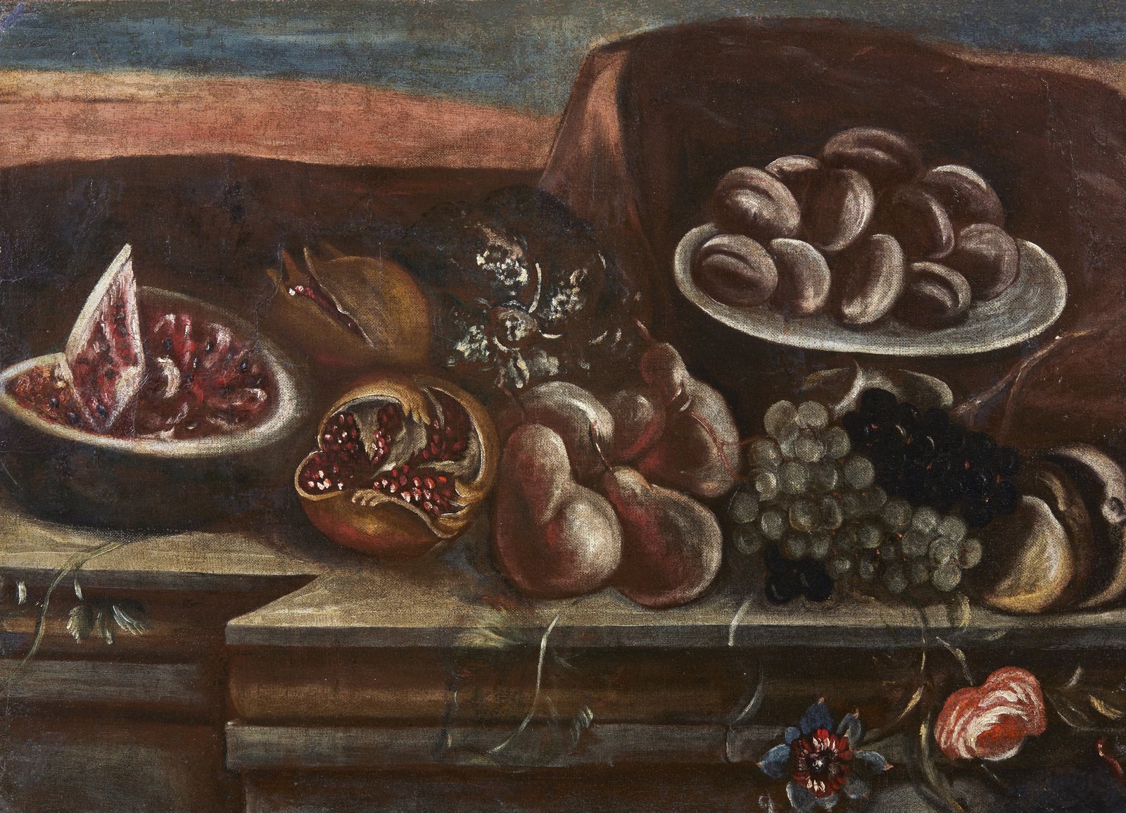 Natura morta di anguria, melograni, uva, prugne e fiori