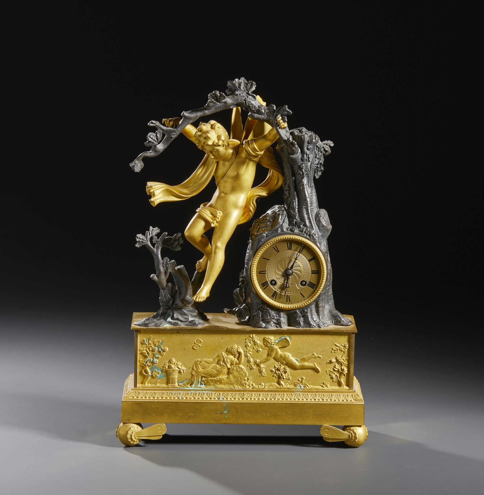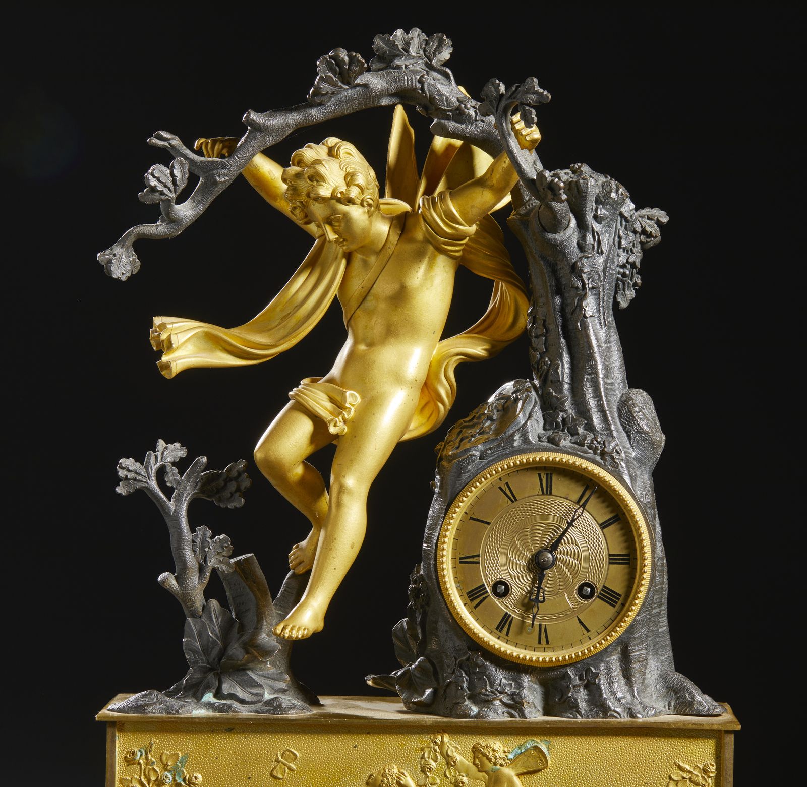 Orologio da tavolo in bronzo dorato e parzialmente brunito con figura di Zefiro, [..]