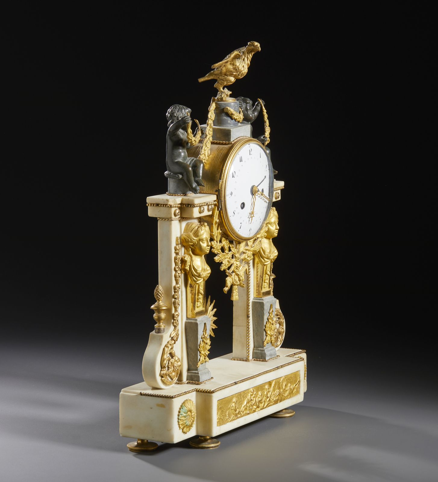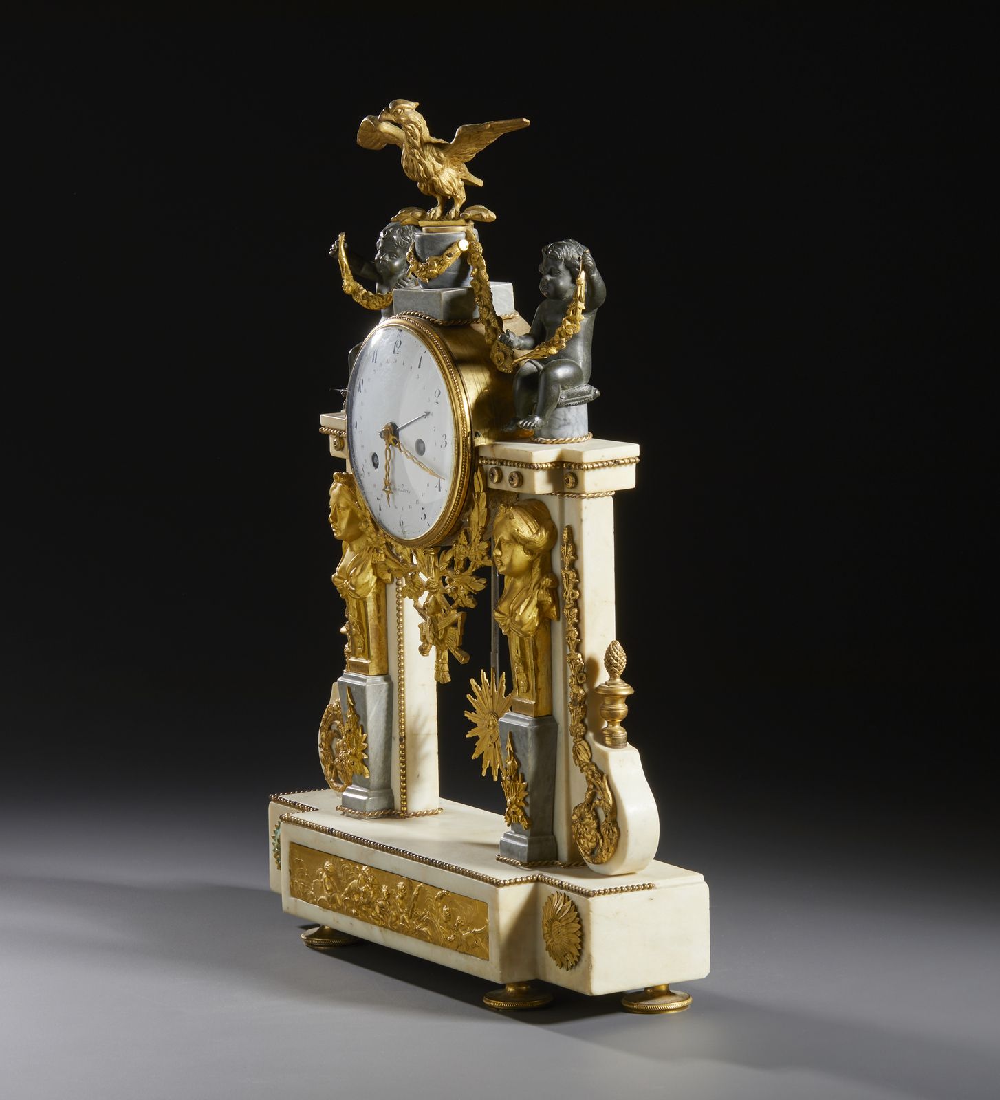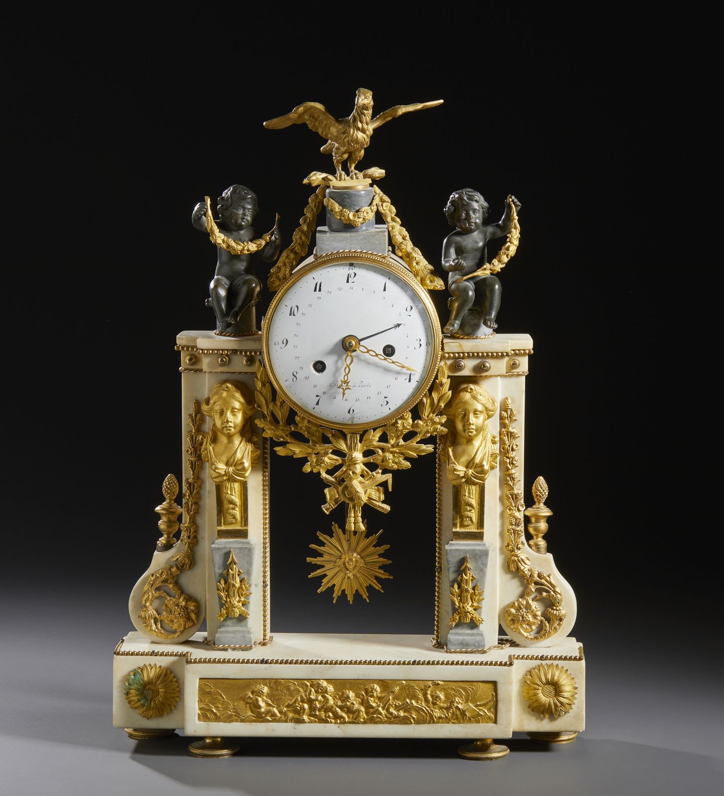 Orologio di impianto architettonico 'a portico' in marmo e bronzi dorati e patinati, [..]