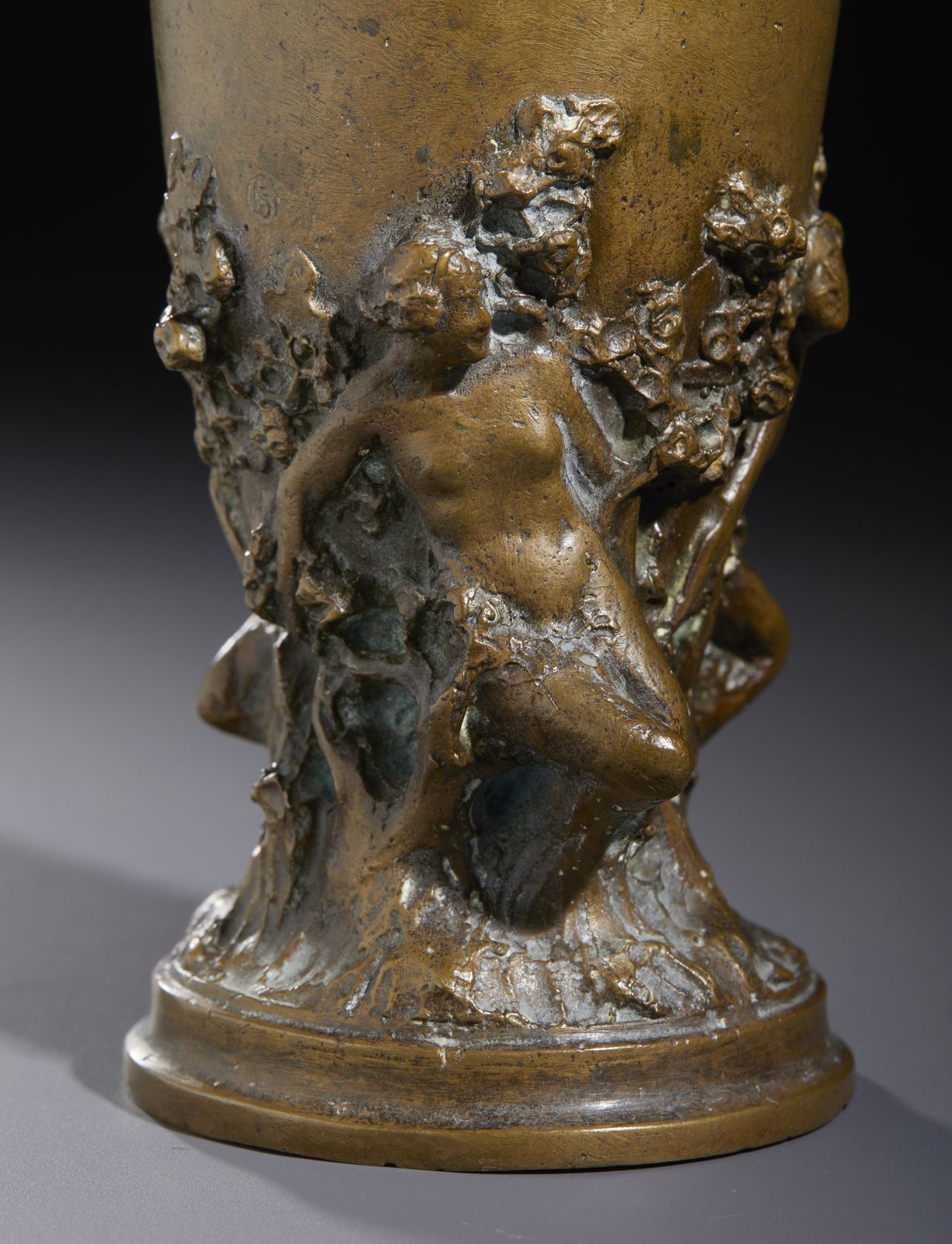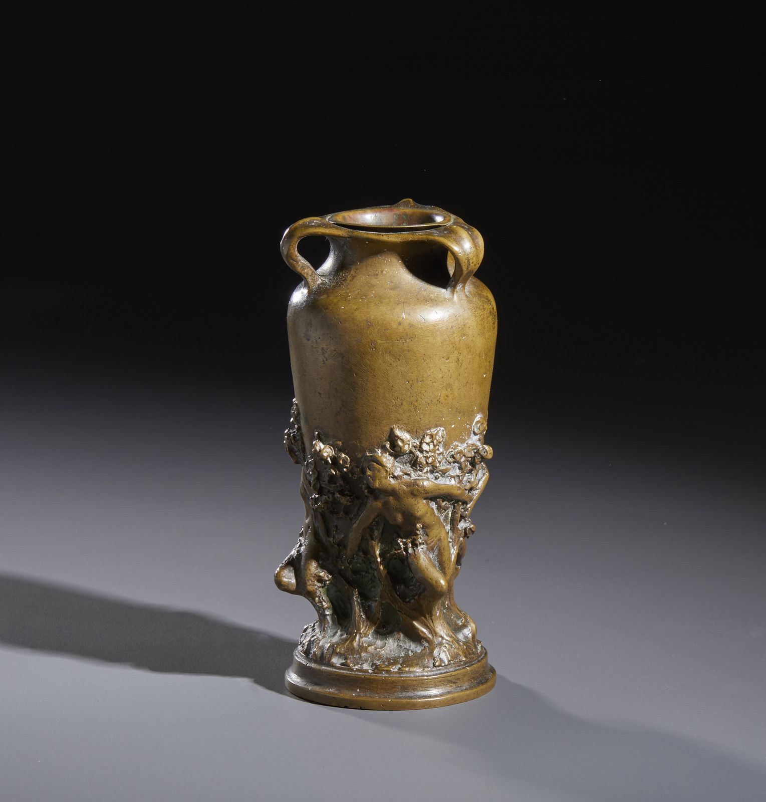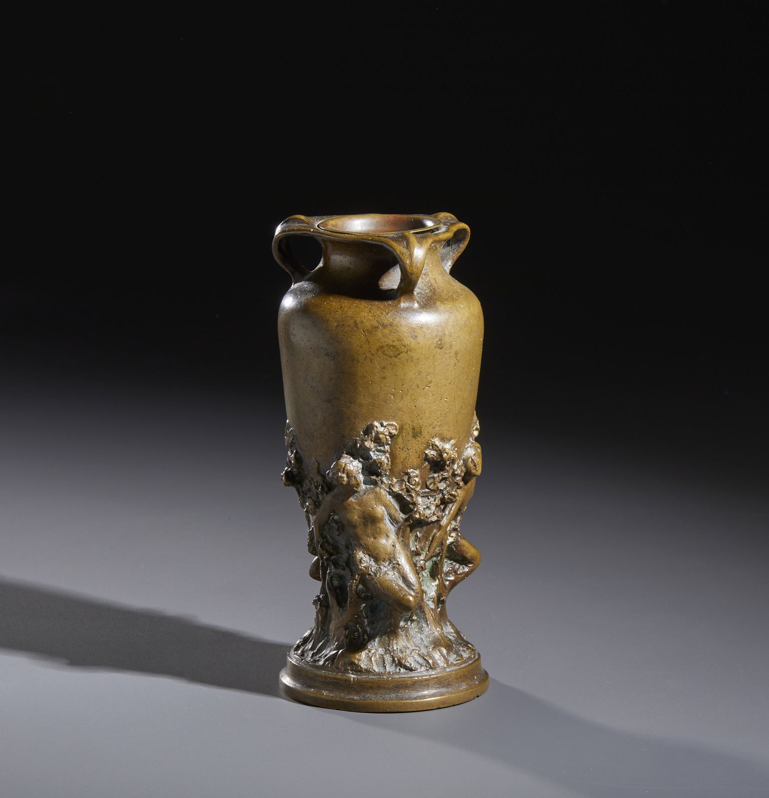 Piccolo vaso triansato in bronzo decorato a rilievo con figure paniche in una se [..]