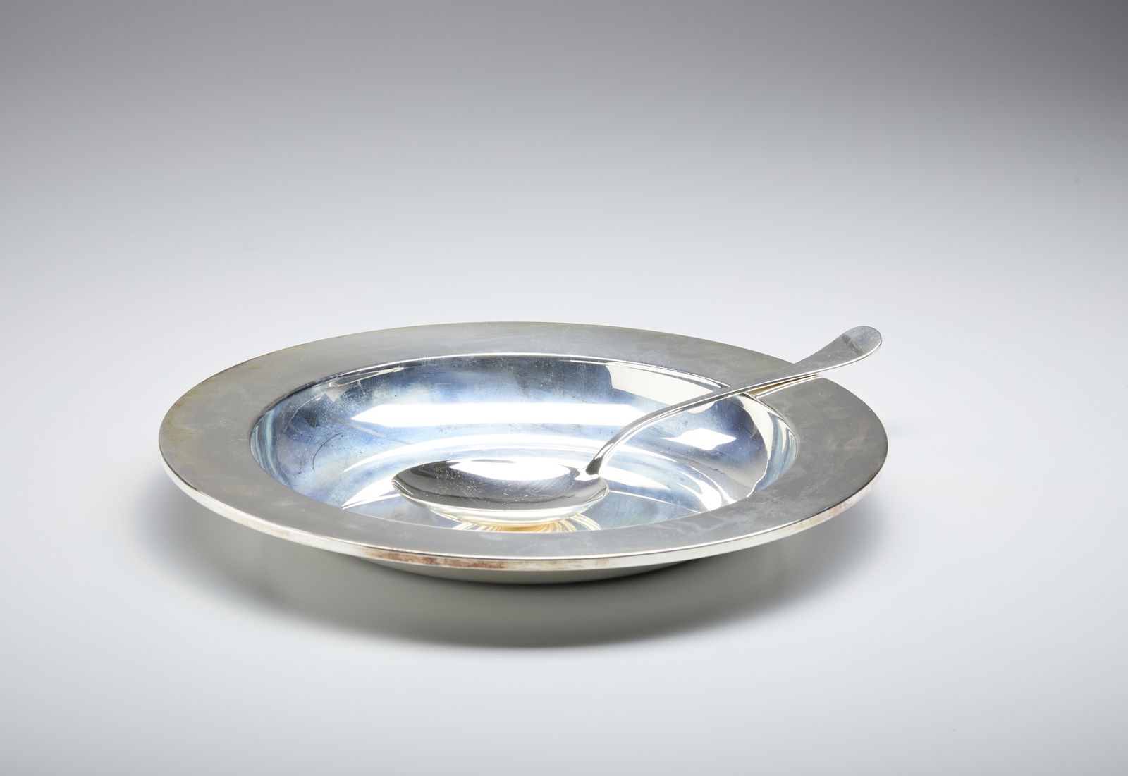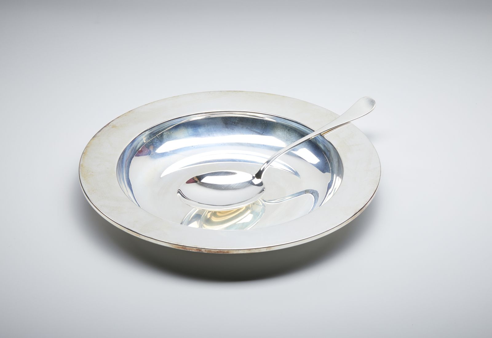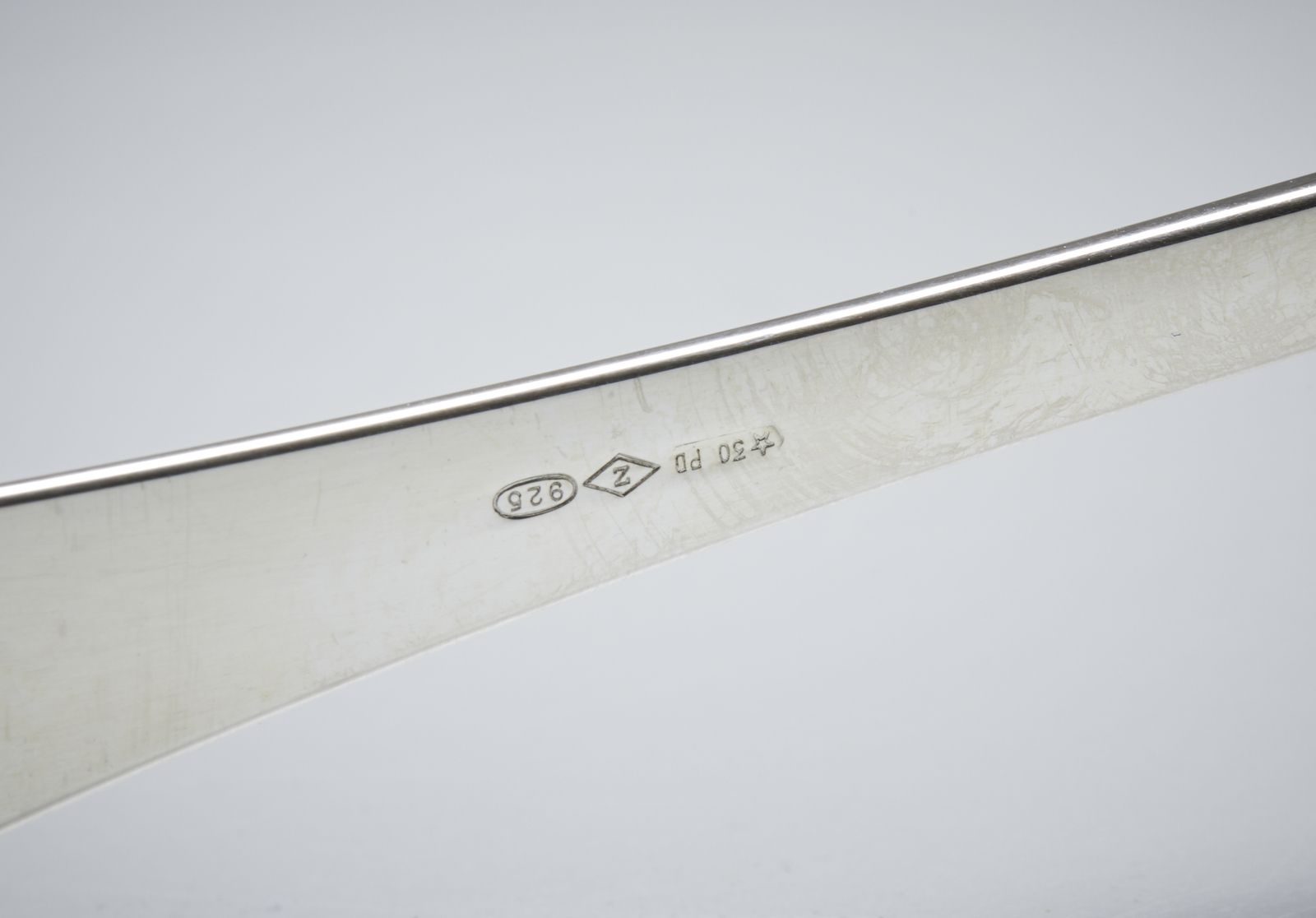 Marchi presenti. Titolo 800 risottiera, titolo 925 il cucchiaio (lunghezza 28 cm).Peso cucchiaio: 0,164 Kg Peso risottiera: 0,774 Kg Peso complessivo: 0,938 Kg