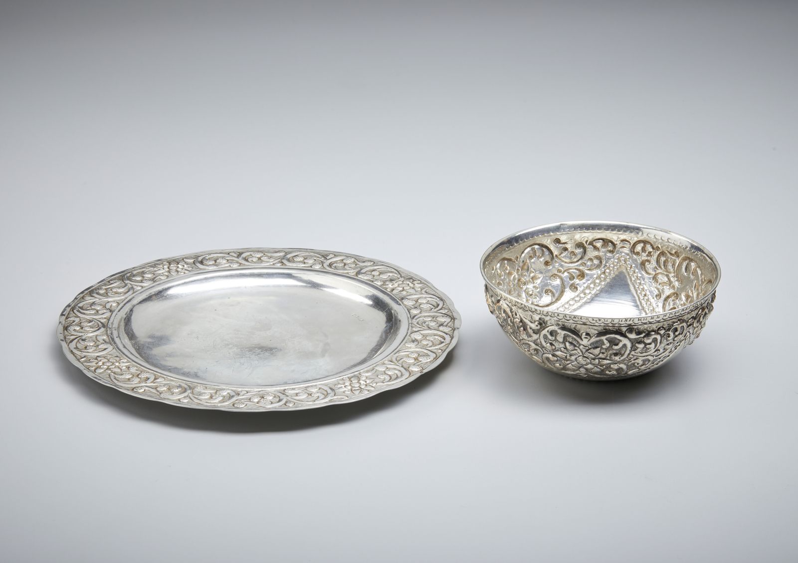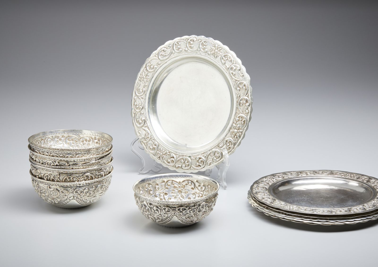 Servizio di sei piattini e sei coppette 'rince doigts' in argento sbalzato a motivi [..]