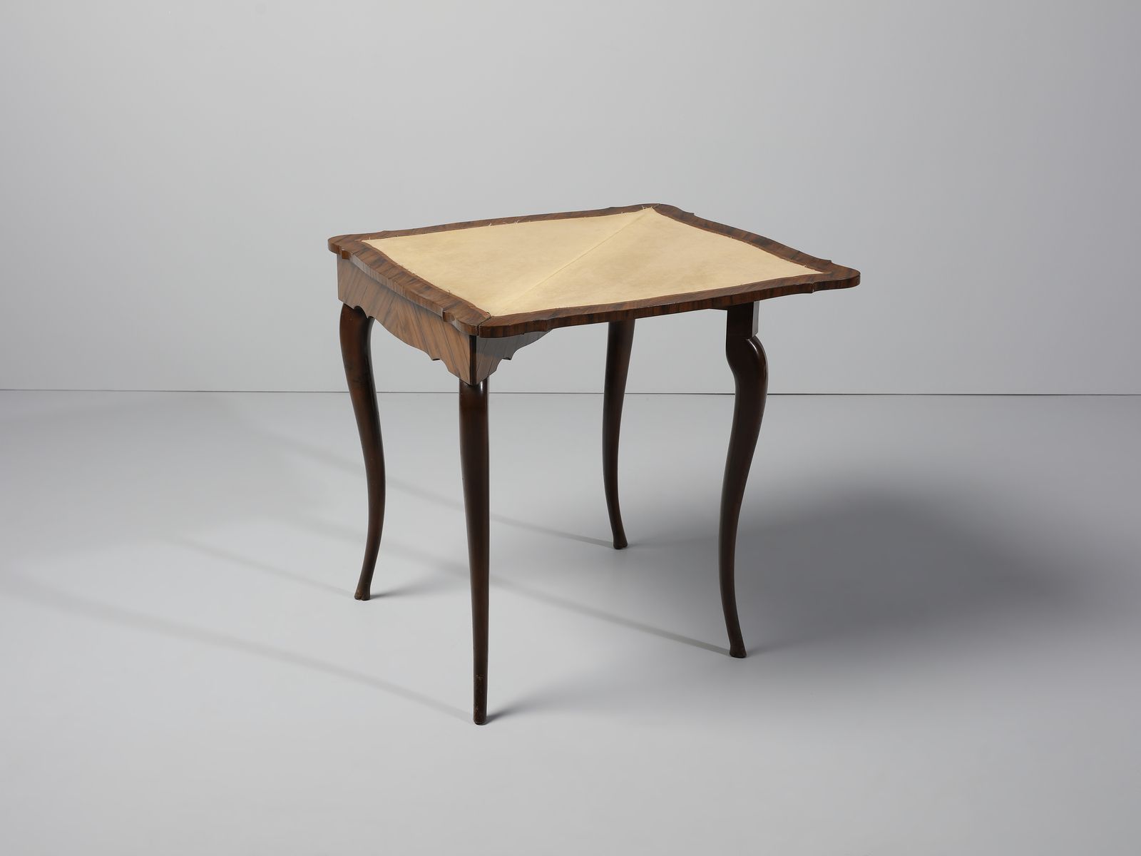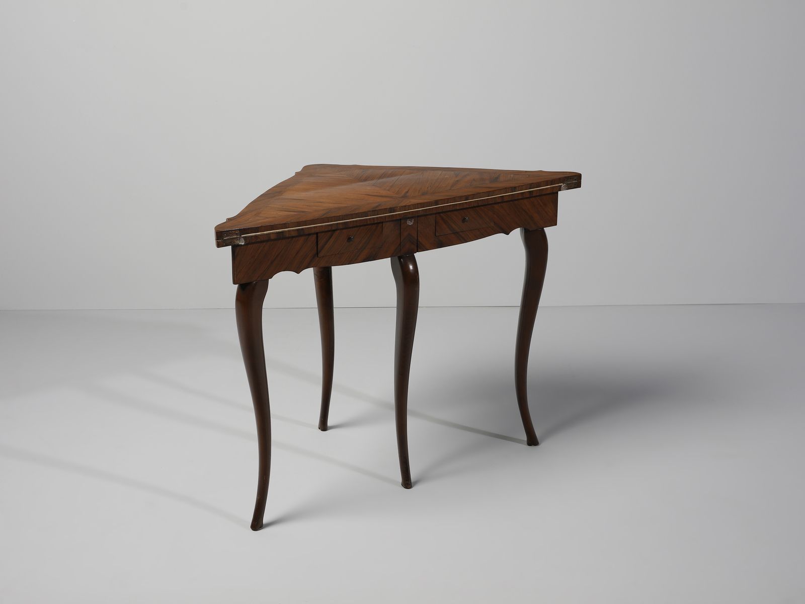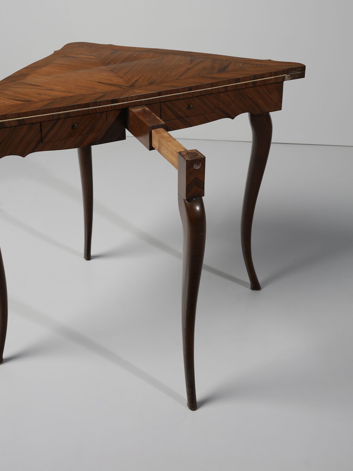 Tavolo da gioco ad angolo apribile lastronato in palissandro, due cassetti sul fronte, [..]