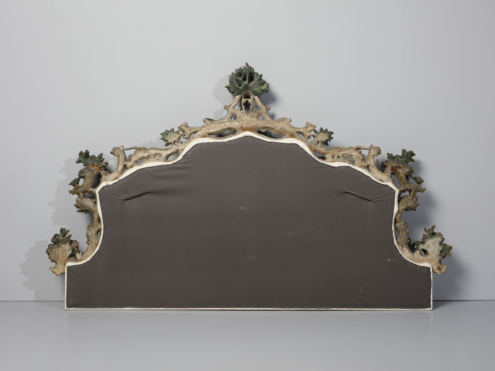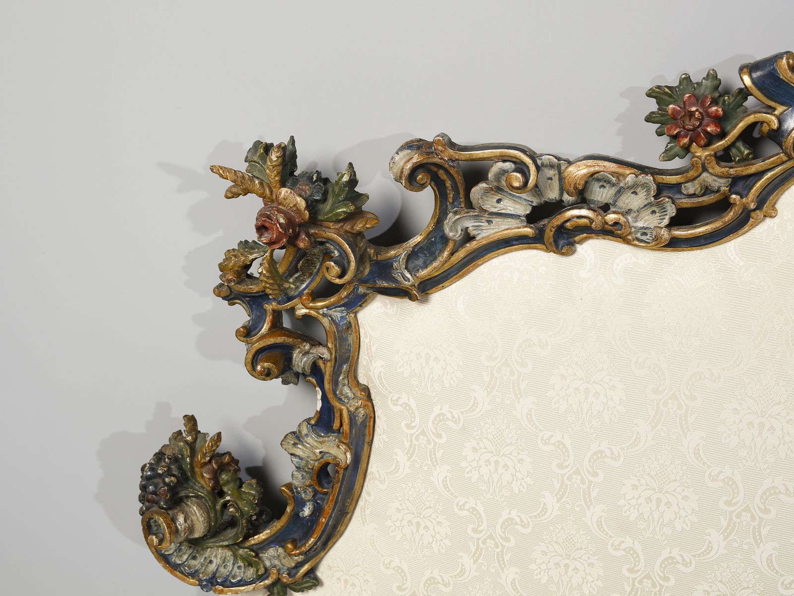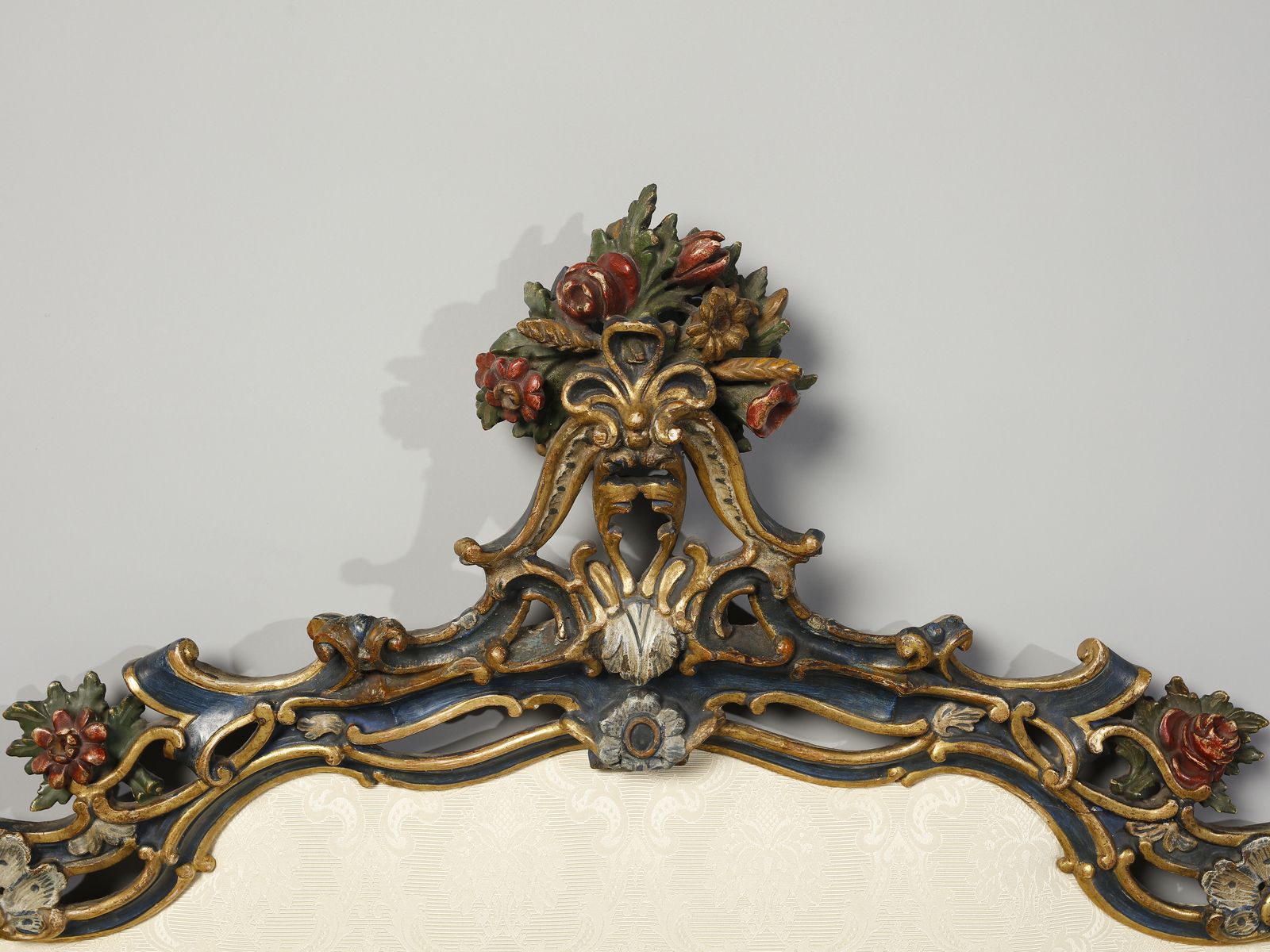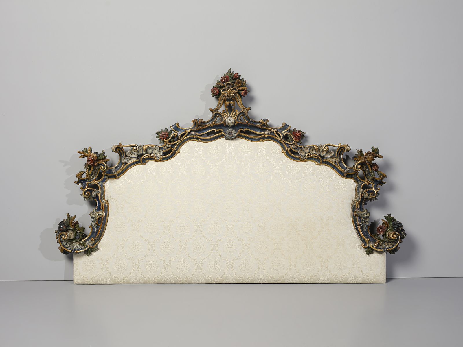 Testiera in legno intagliato, dipinto e parzialmente dorato, decorazioni a motivi [..]