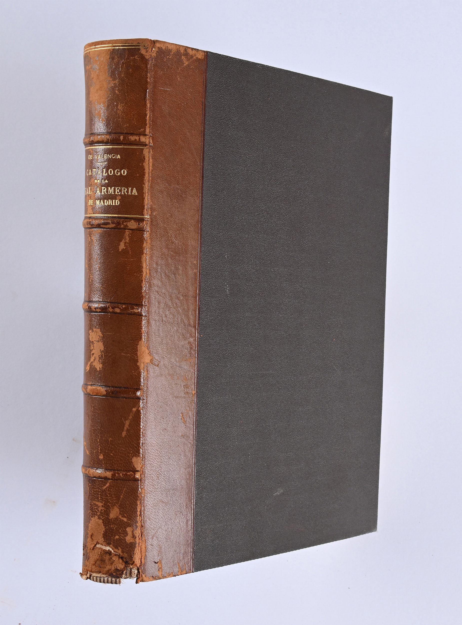cm 29x21,5 Hauser y Menet, Madrid 1898 In Folio piccolo. Illustrato con 338 incisioni nel testo e 26 fuori testo che raffigurano armi, armature e marchi. L'Armeria Reale spagnola custodisce una delle più numerose, ricche e complete collezioni di armi ed armature del passato al mondo, per la ricchezza, l'alto livello artistico, per il livello degli armaioli e per le committenze reali da Carlo V a Filippo II e agli altri re spagnoli. Legatura in mezza pelle a 5 nervi con titolo in oro al dorso.