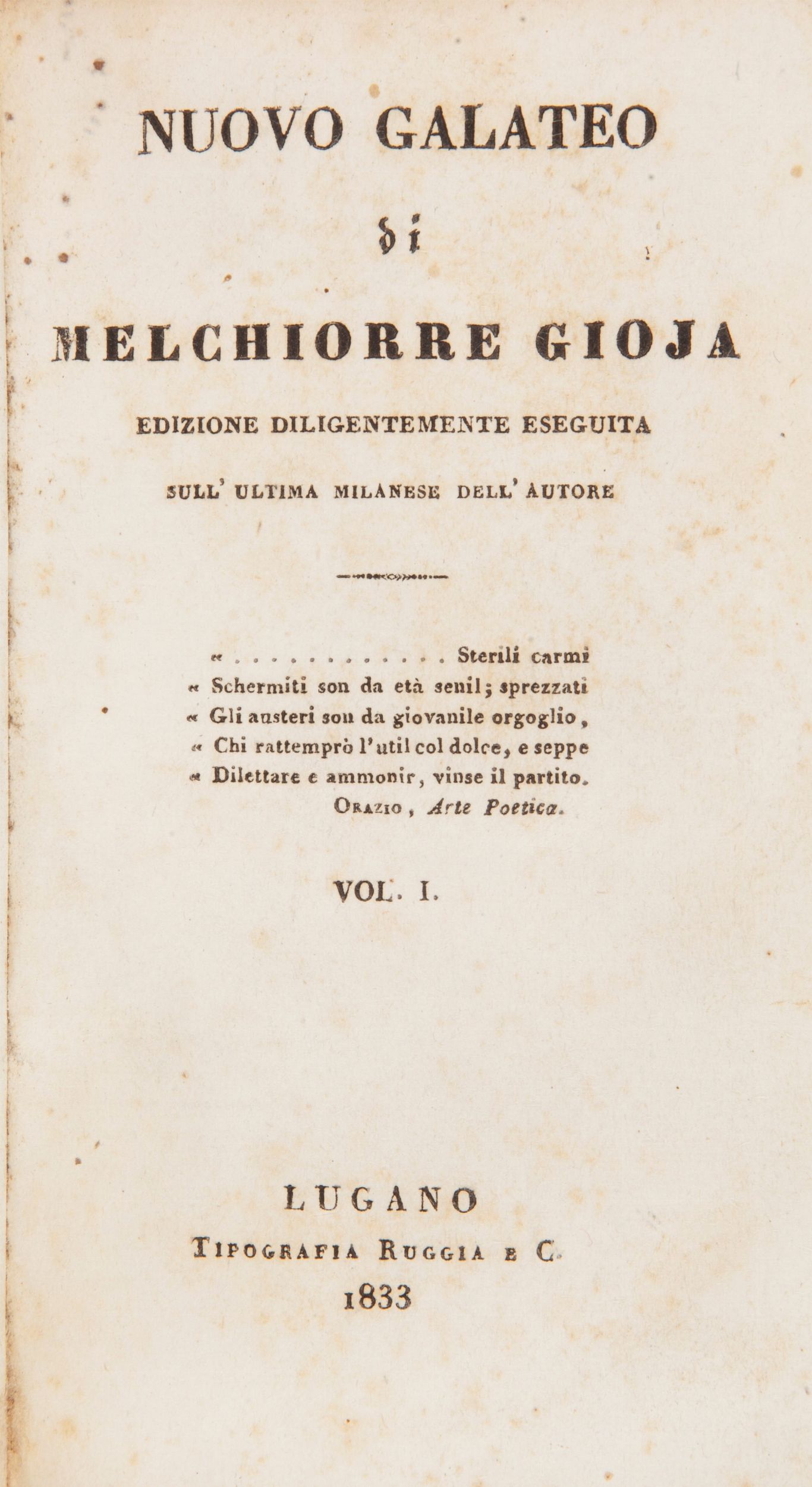 In 16° Testo fondamentale nella storia dei Galatei, il Nuovo Galateo di Gioia fu scritto per contribuire alla civilizzazione del popolo della Repubblica Cisalpina. Stampato in molte edizioni: la prima del 1802 si sofferma sulla definizione laica di pulitezza intesa come ramo della civilizzazione, arte di modellare la persona e le azioni, i sentimenti, i discorsi in modo da rendere gli altri contenti di noi e di loro stessi. Nella seconda del 1820 ridimensiona il concetto di pulitezza come l'arte di modellare la persona in modo da procurarsi l'altrui stima ed affezione. Nella terza edizione del 1822, a differenza dell'edizioni precedenti, si enfatizza l'importanza del concetto di ragione sociale, considerato dall'autore il fondamento etico del galateo che avrebbe portato felicità e pace sociale mediante le buone maniere XIX secolo. Legature in mezza pelle coeva con titoli in oro ai dorsi.