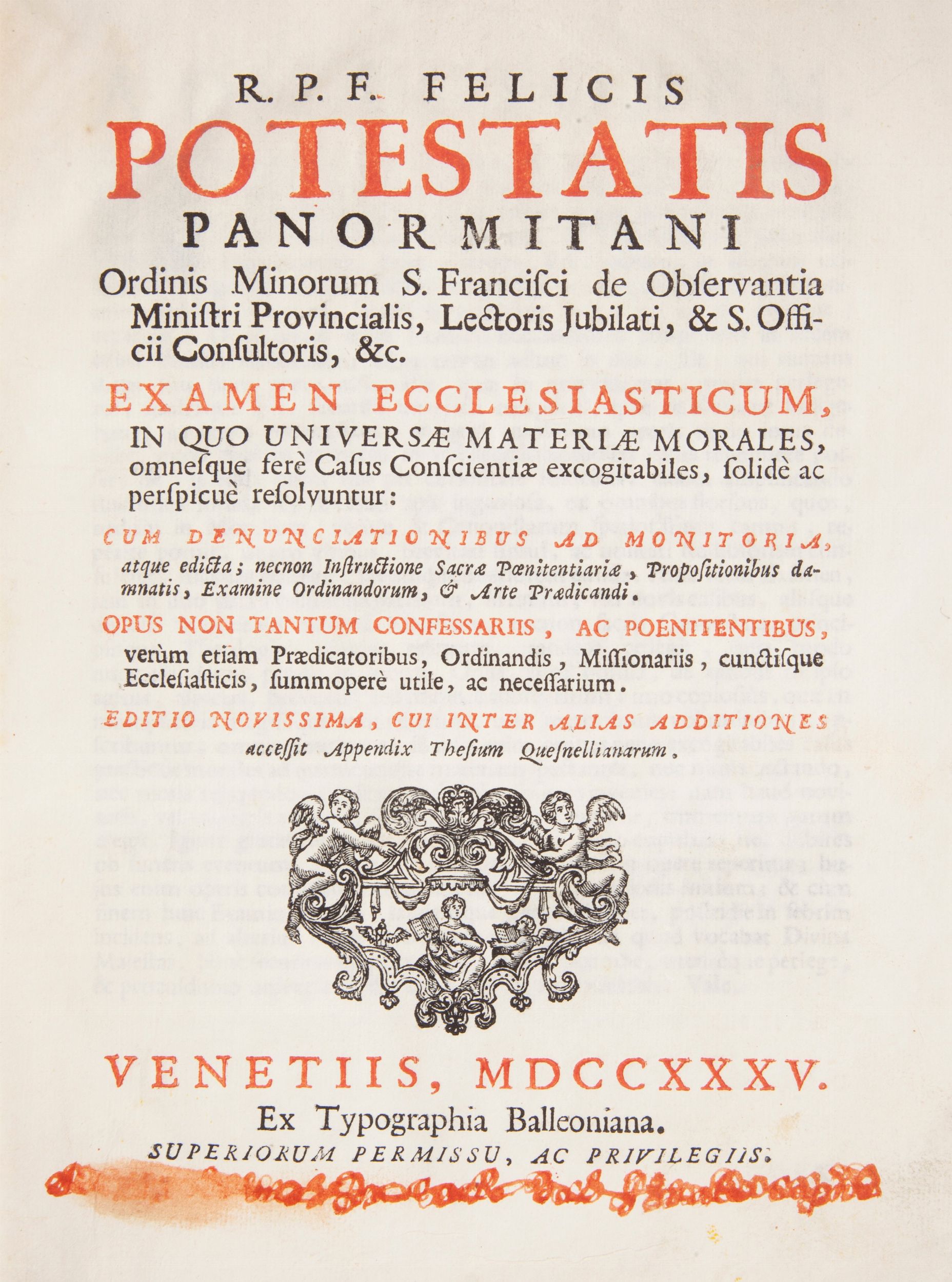 cm 25x18 Tipografia Balleoniana, Venezia 1735 In 4° Teologo palermitano (1649-1702) fu giudice del Sant'Uffizio, esaminatore sinodale, censore di libri e celebrato autore di quest'opera che costituisce un manuale di pratica ecclesiastica. Legatura coeva in piena pergamena con spellature al dorso.
