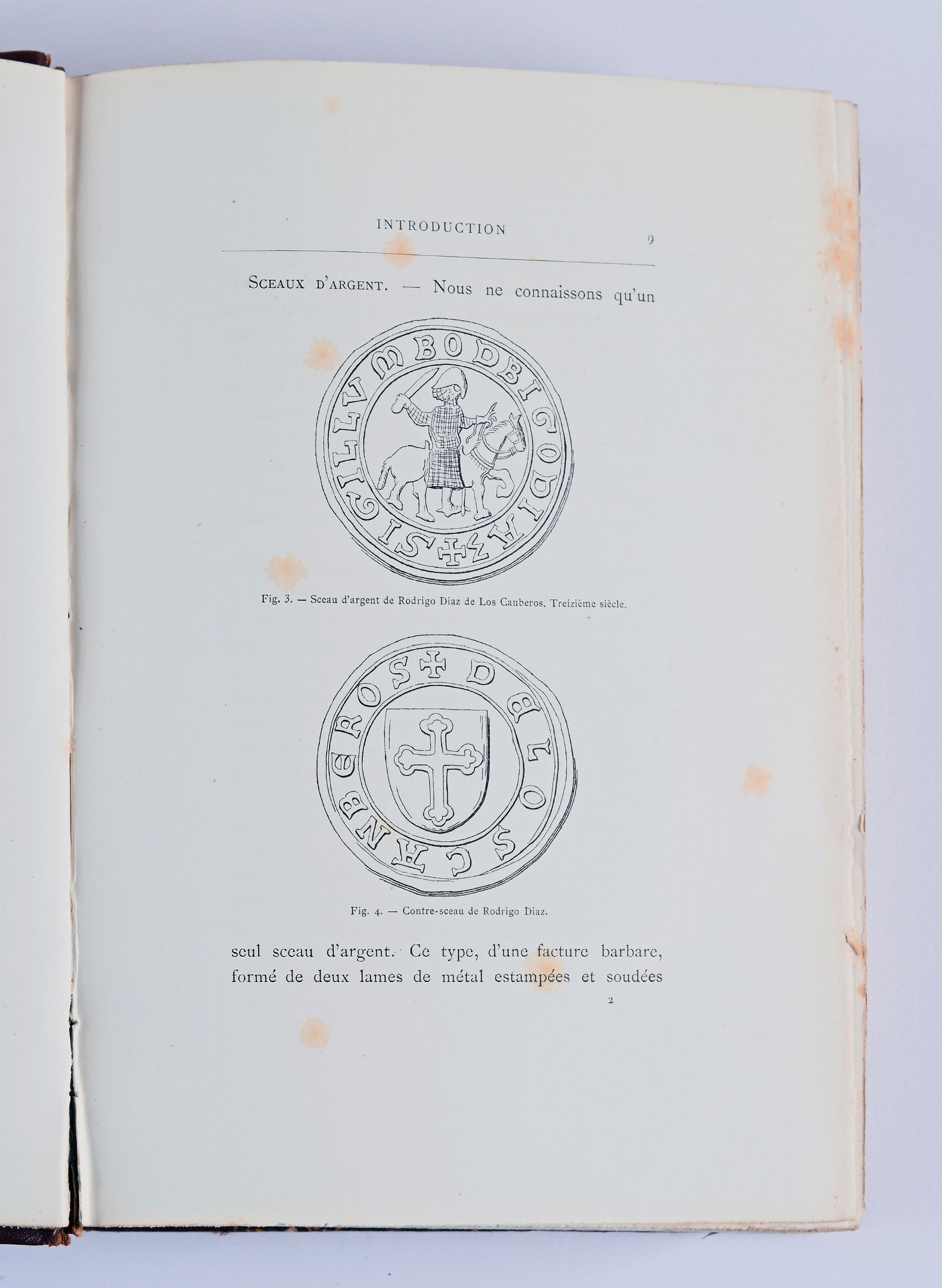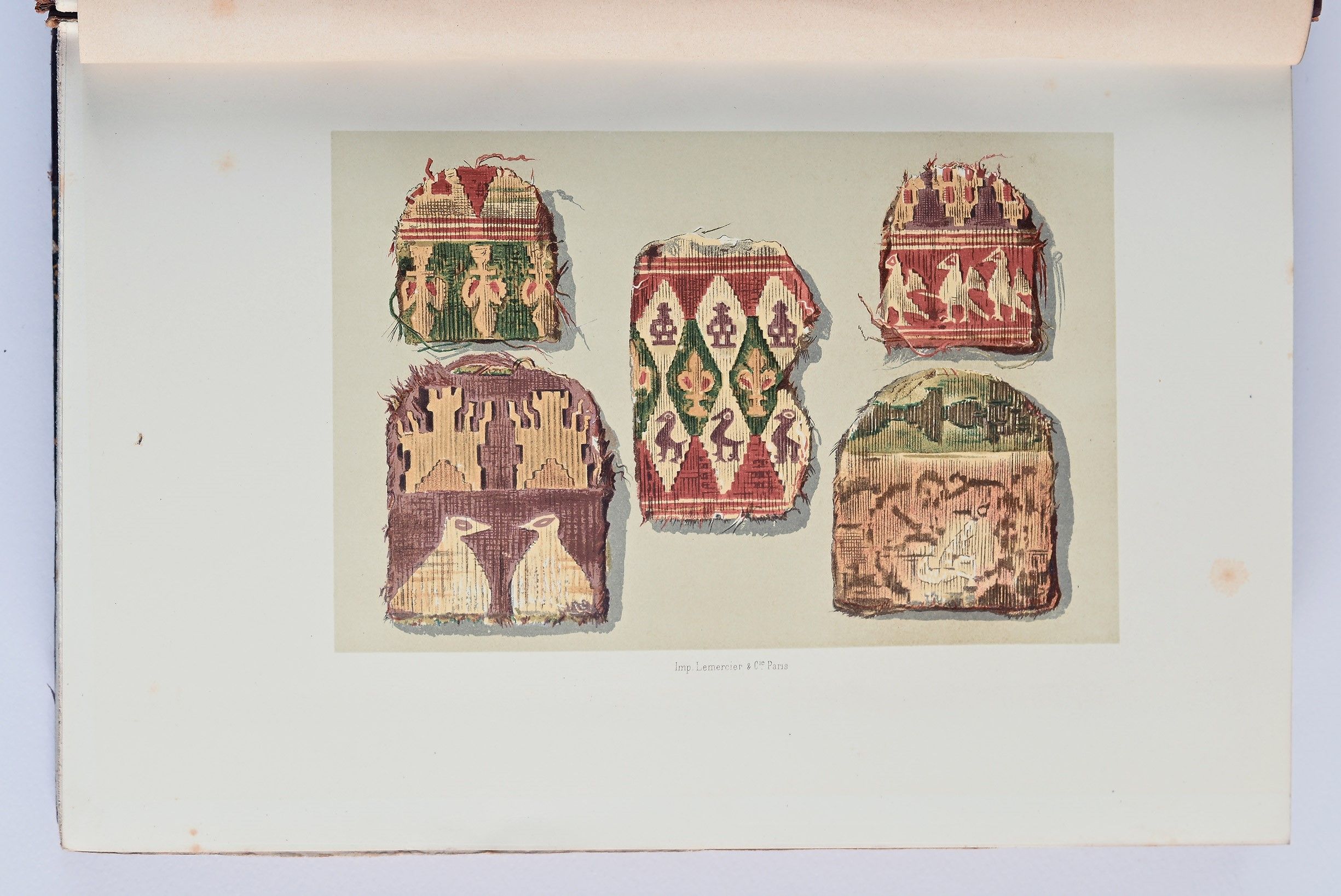 cm 29x21 Dumoulin et Cie, Parigi 1880 Prima edizione di questa interessante opera sull'abbigliamento, sull'araldica, sulle armi ed armature medievali, di Germain Demay archivista dell'Archivio Nazionale francese. Illustrata con 2 tavole cromolitografiche fuori testo e 567 figure dentro e fuori testo disegnate da P. Sellier. Legatura coeva in mezza pelle a 4 nervi con angoli in pelle, titolo e fregi in oro al dorso.