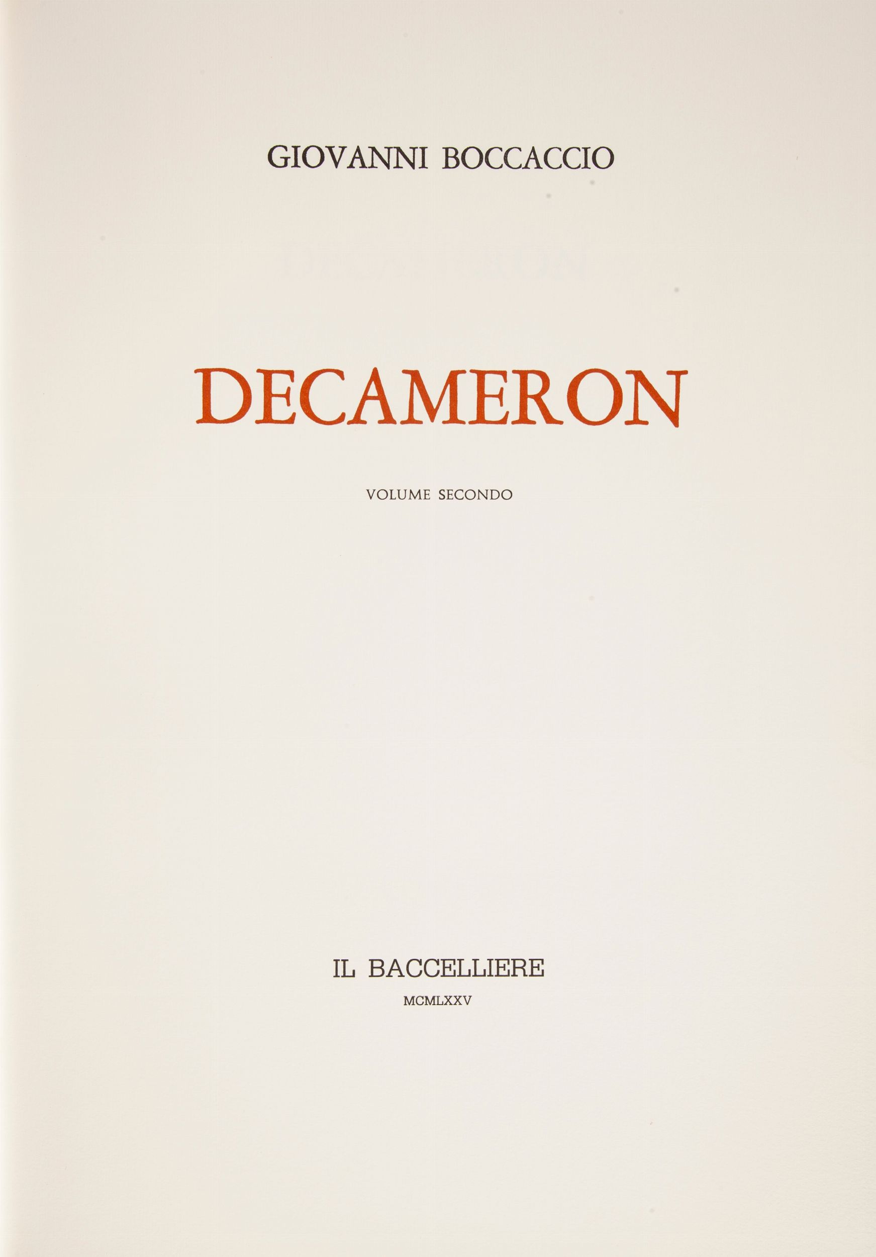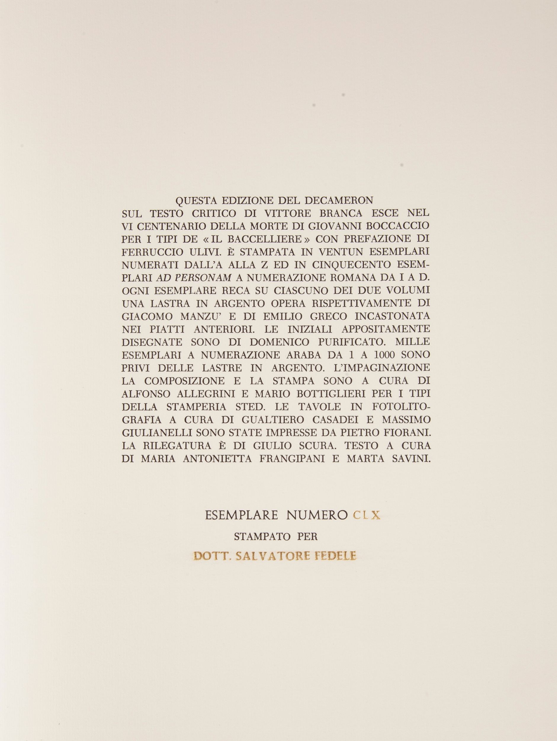 Edizione integrale in tiratura limitata di 500 esemplari in numeri romani ad personam, ns n. CLX, con disegni di Domenico Purificato e due incisioni originali su lastre in argento di Giacomo ManzĂą ed Emilio Greco incastonate nei piatti anteriori. Legatura in piena pelle di Giulio Scura. Entro cofanetti originali di plexiglass.