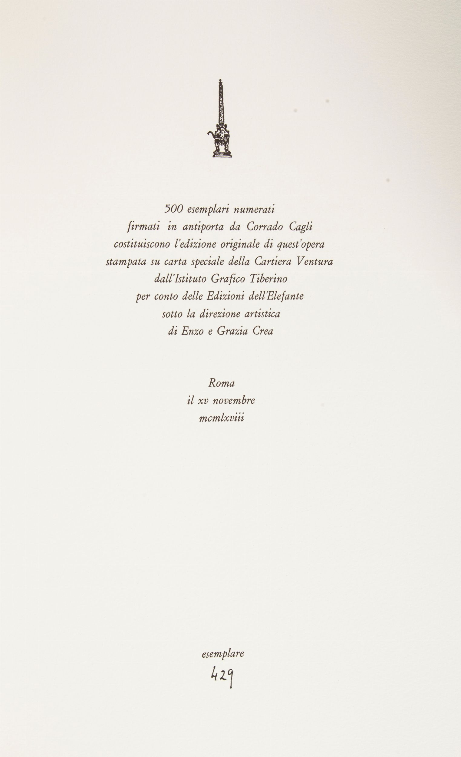 cm 54x38 Edizioni dell' Elefante, Roma 1968 Tiratura limitata di 500 Esemplari firmati dal Maestro Corrado Cagli ns. n. 429. Con un saggio di Giorgio Seferis. Legatura in piena pelle con titoli in oro, entro cofanetto originale di plexiglass con bassorilievo in bronzo originale firmato dal Maestro Marino Haupt.