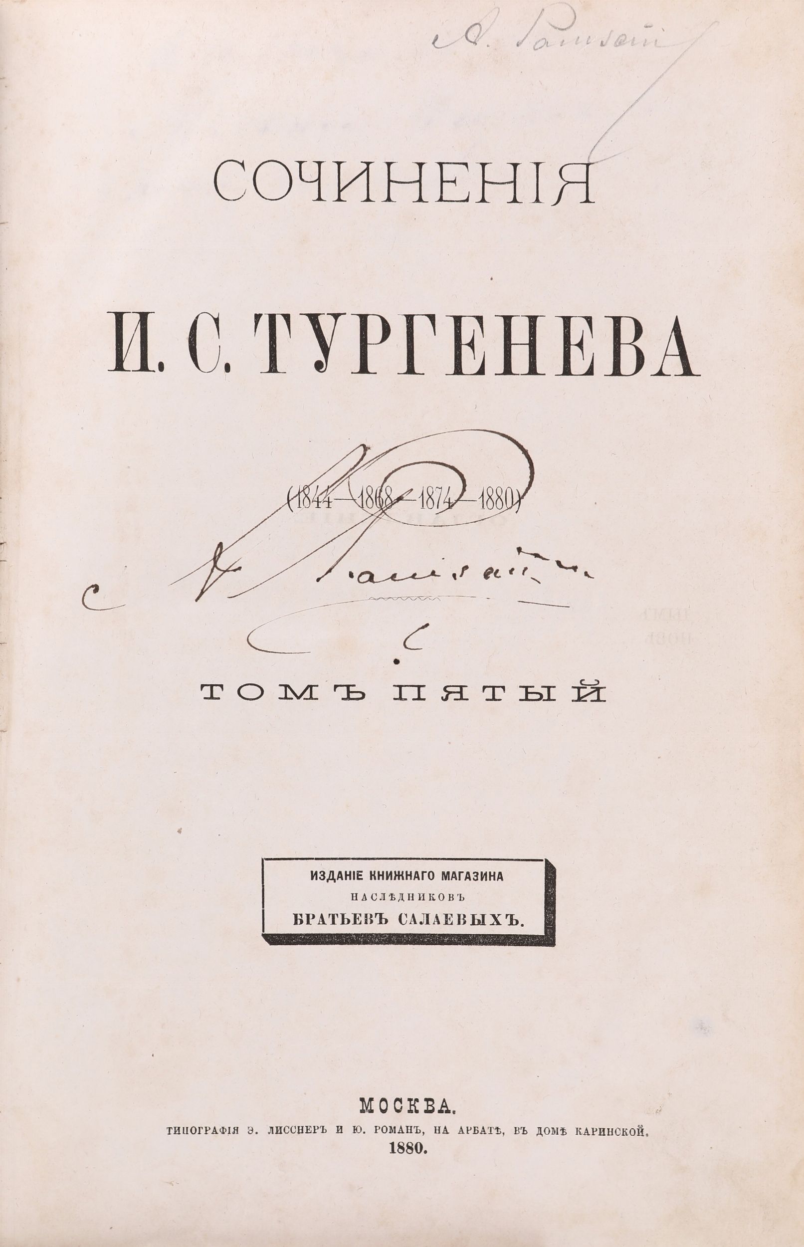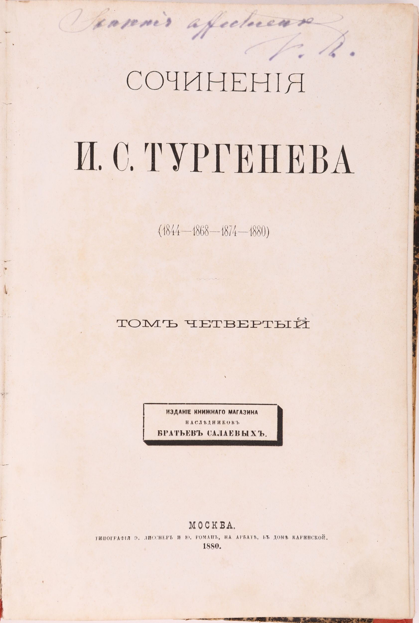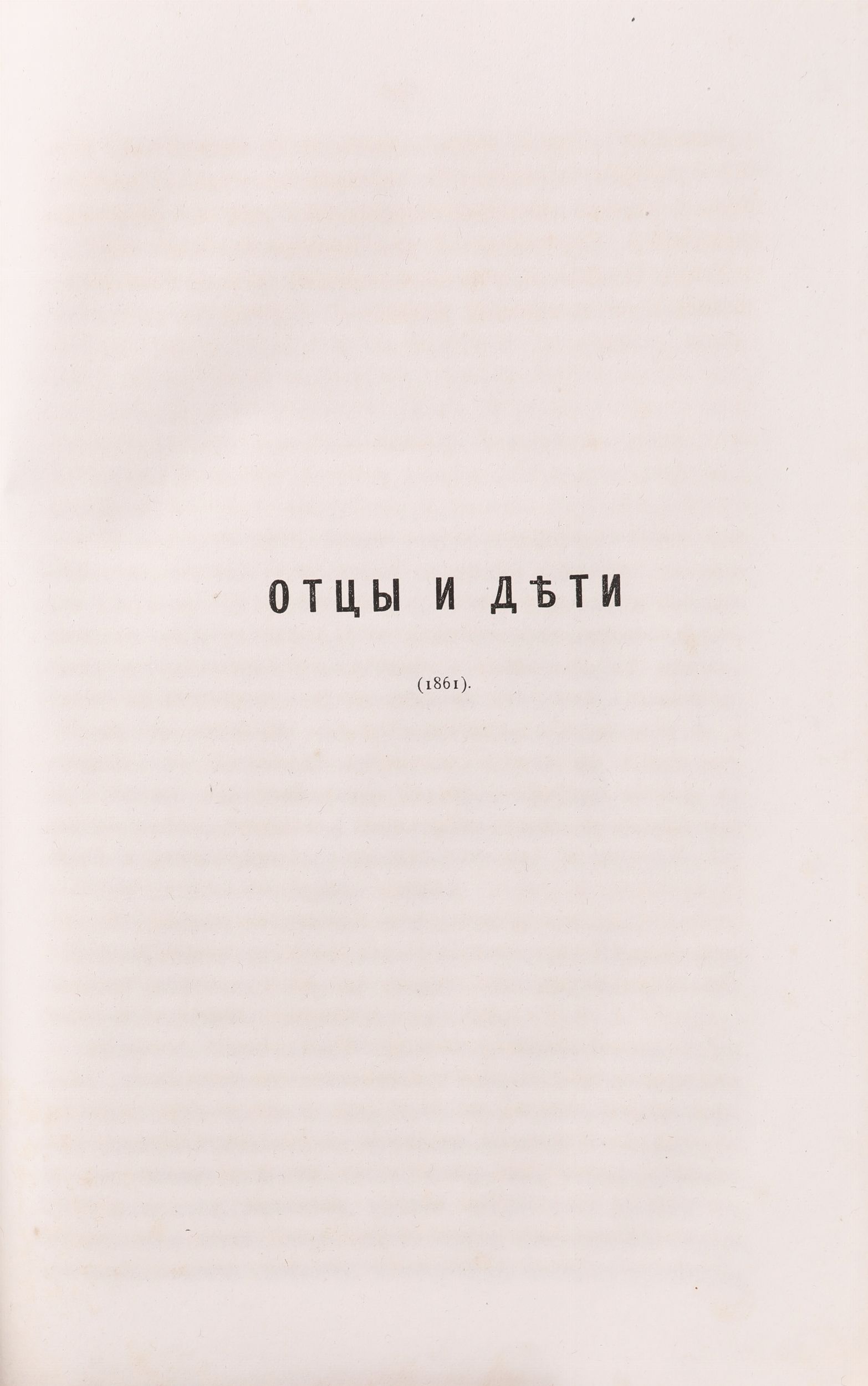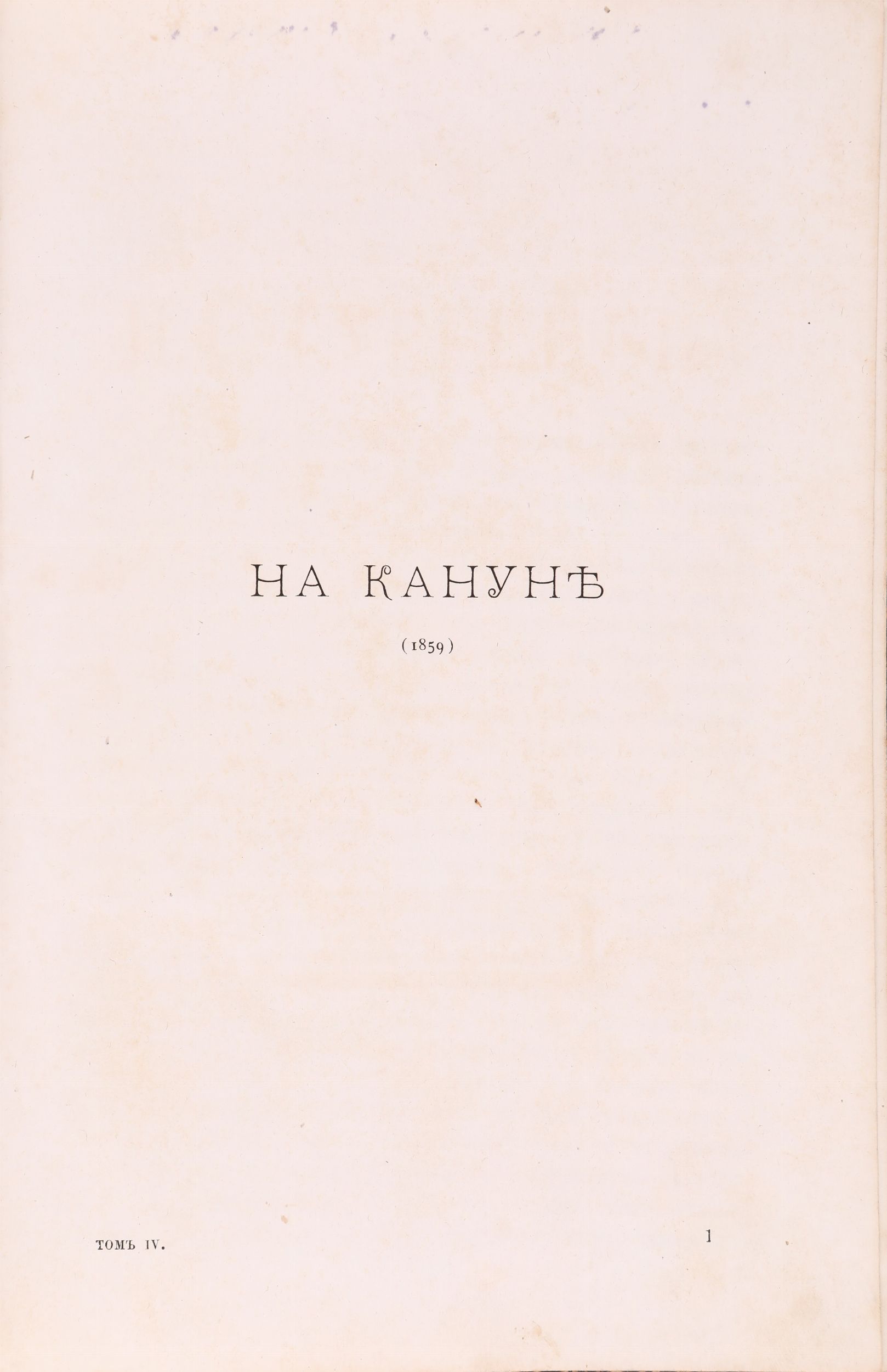 In 8°. Solo 2 Volumi: Tomo quarto con Alla Vigilia del 1859 e Padri e figli del 1861, e Tomo quinto con Fumo del 1867 e Terra Vergine del 1877. Edizione della raccolta delle opere del celebre scrittore e drammaturgo russo stampata ancora in vita l'autore. Legatura in mezza tela coeva