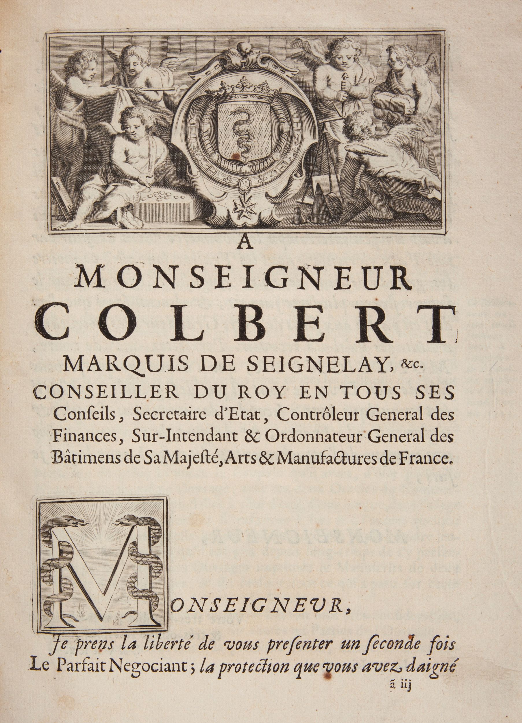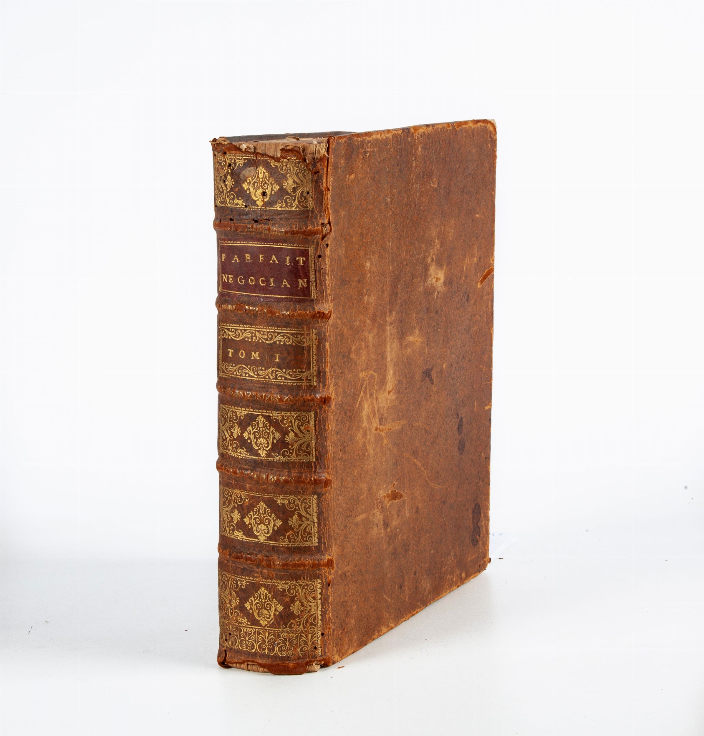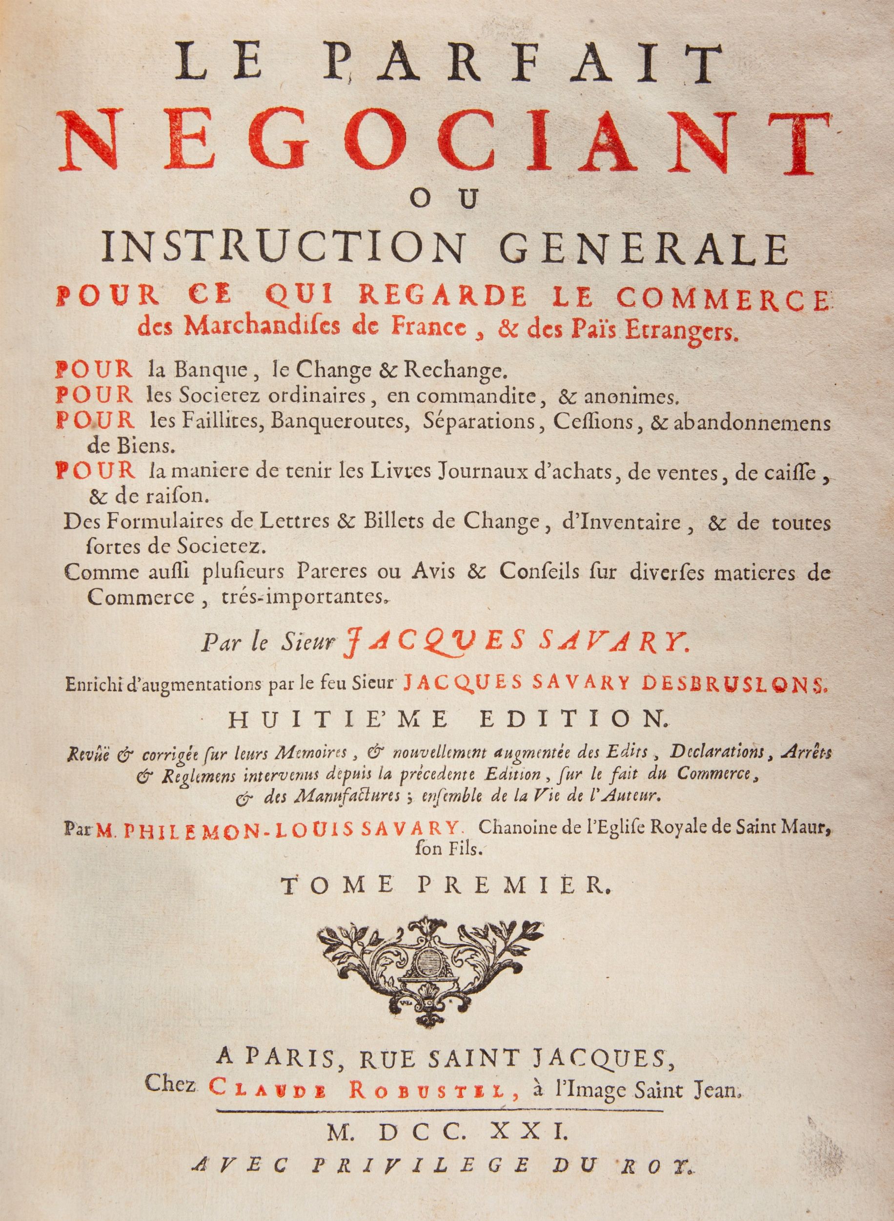 cm 25,5x21 Chez Claude Robustel, Parigi 1721 in 4°. Solo Tomo Primo Completo. Illustrato con un'incisione di Edelink in antiporta raffigurante il Ritratto del Savary e una tavola a piena pagina di Pierre Landry con una scena di commercio tra mercanti presso un porto. Legatura coeva in piena pelle a 5 nervi con titoli e fregi in oro al dorso (lievi difetti.