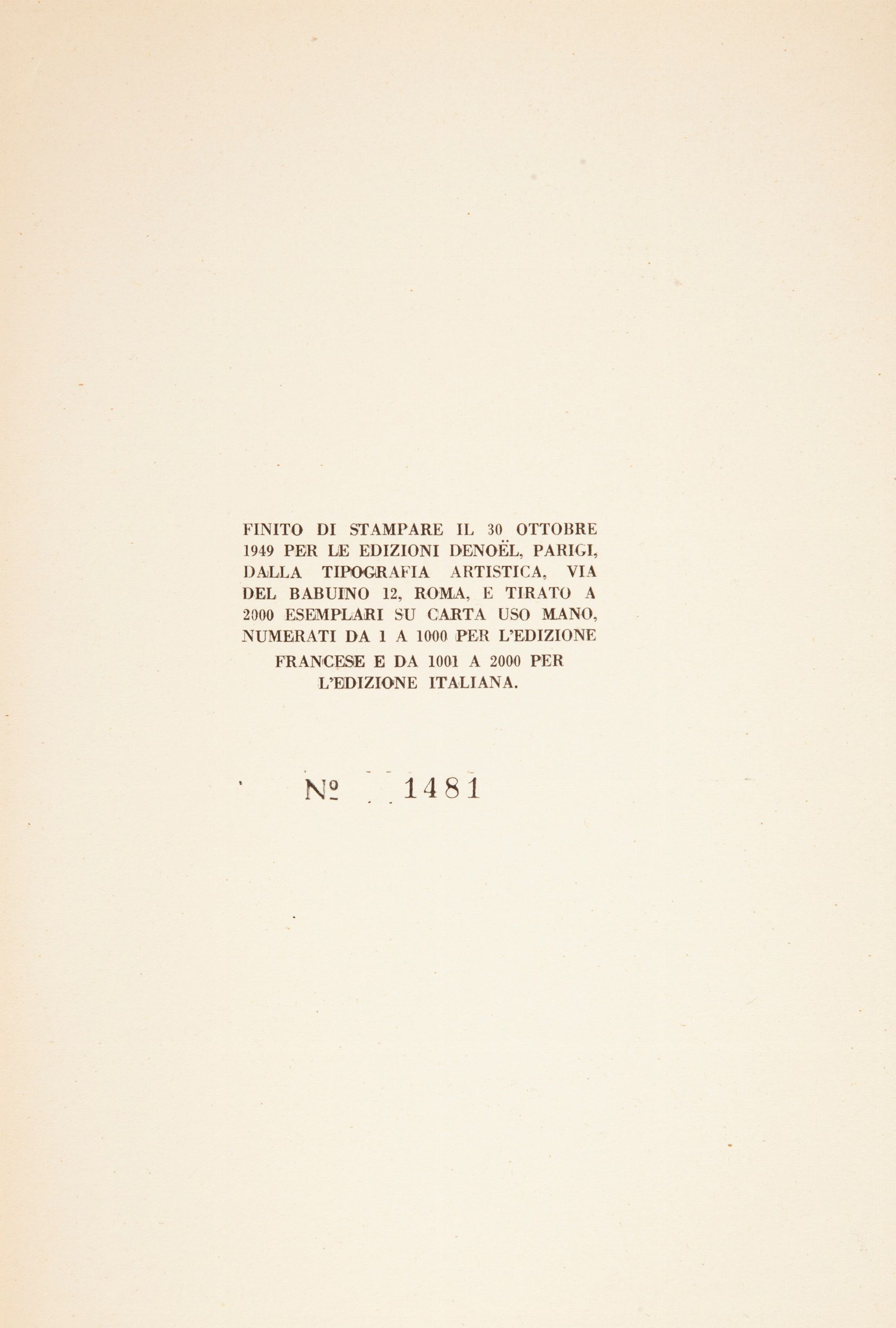 Collezione dell'Obelisco, Roma 1949 9 disegni nel testo e 30 tavole. Tiratura limitata a 2.000 esemplari numerati (da 1 a 1.000 nella versione francese e da 1.001 a 2.000 nella versione italiana), ns esemplare n. 1.481