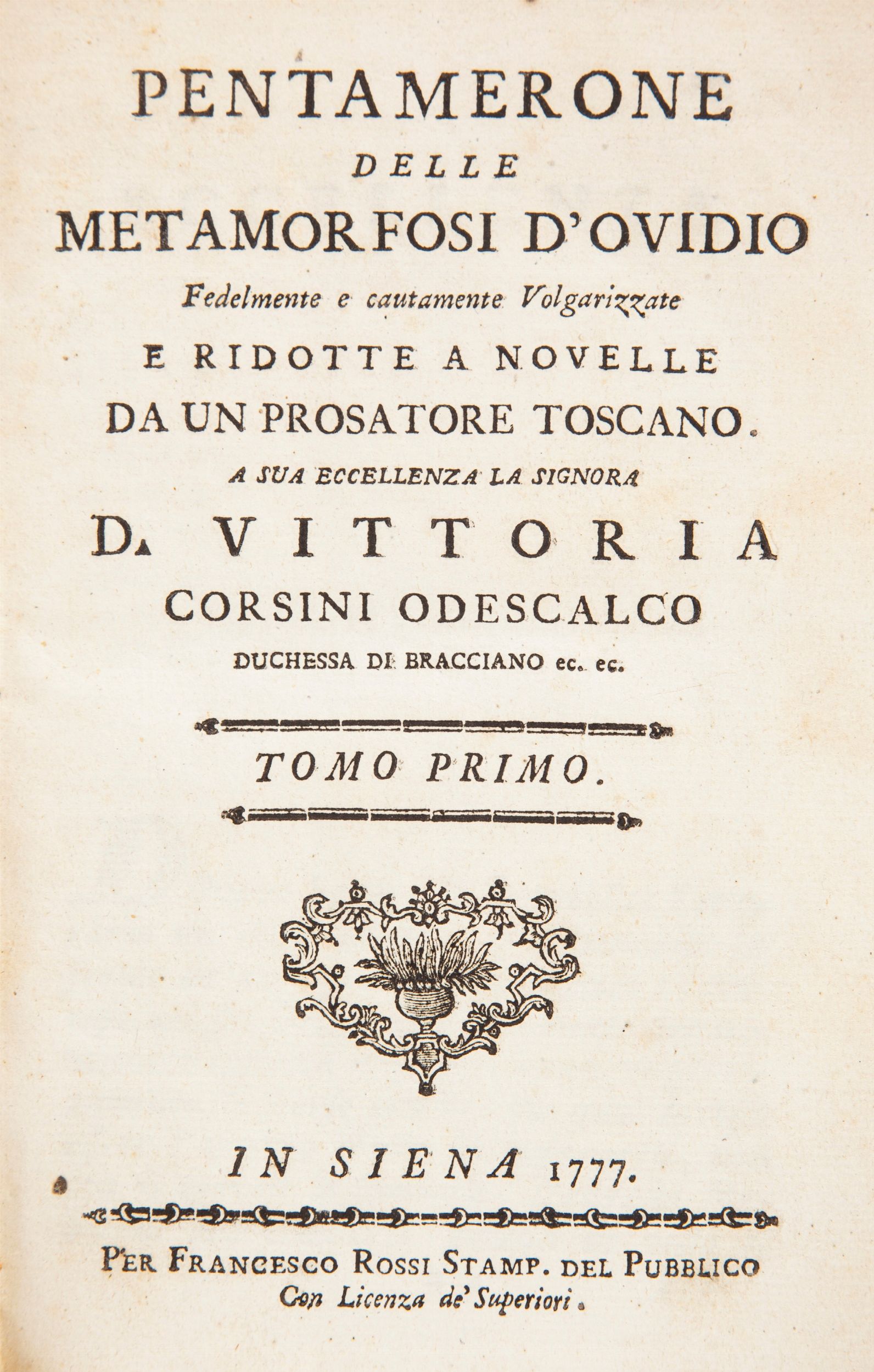 cm 18x12 Francesco Rossi, Siena 1777 In 8° 2 Volumi. Traduzione in volgare di Giuseppe Ramirez che ridusse le Metamorfosi a Giornate ed a Novelle per dar loro un qualche metodo, che ne rendesse più facile e più gradevole la lettura. Espose infine le favole ovidiane con una nitidezza ed una chiarezza tale, che il lettore non si arresta un momento per intenderle. Legature in mezza pelle con angoli in pelle, titoli e fregi in oro ai dorsi.