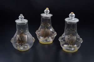 Lotto di oggetti in vetro e un'oliera in metallo.