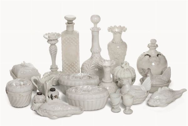 Diciannove oggetti in vetro lattimo, fine XIX e inizio XX secolo.