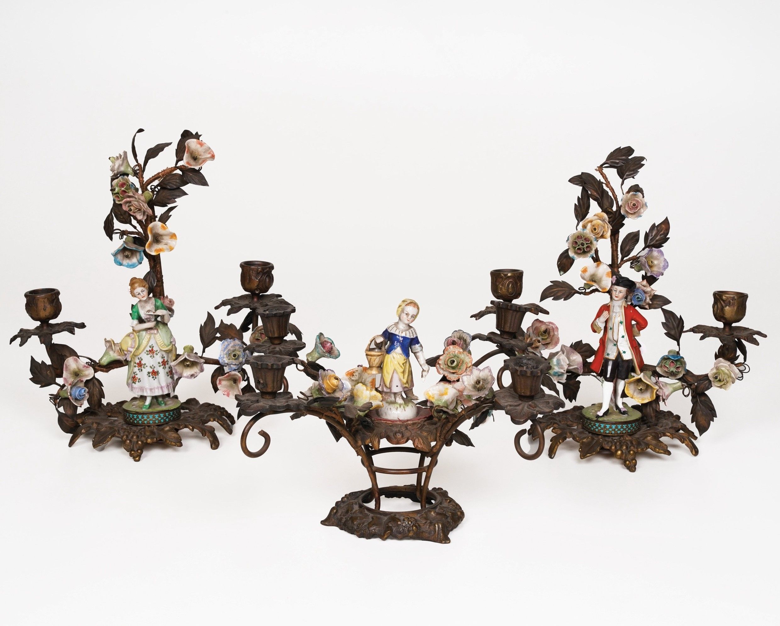 Tre candelabri in bronzo con figurine e fiori in porcellana, fine XIX inizio XX [..]