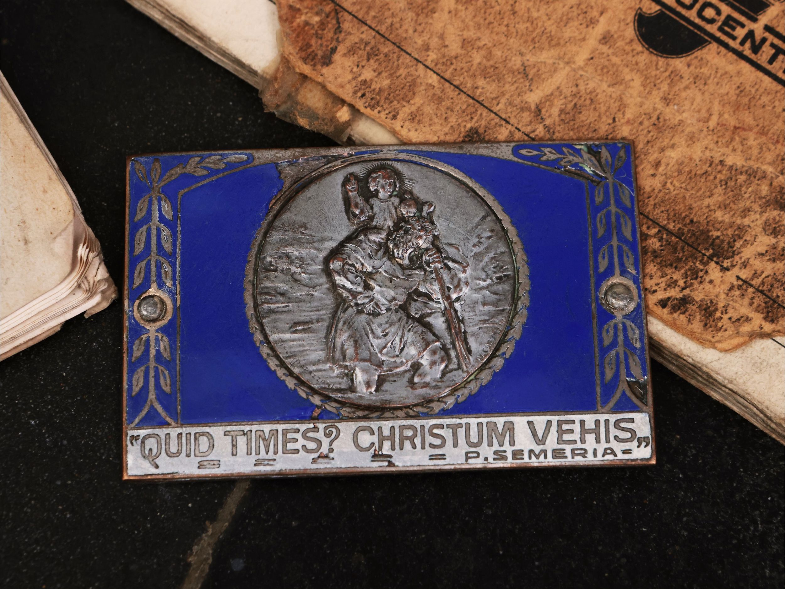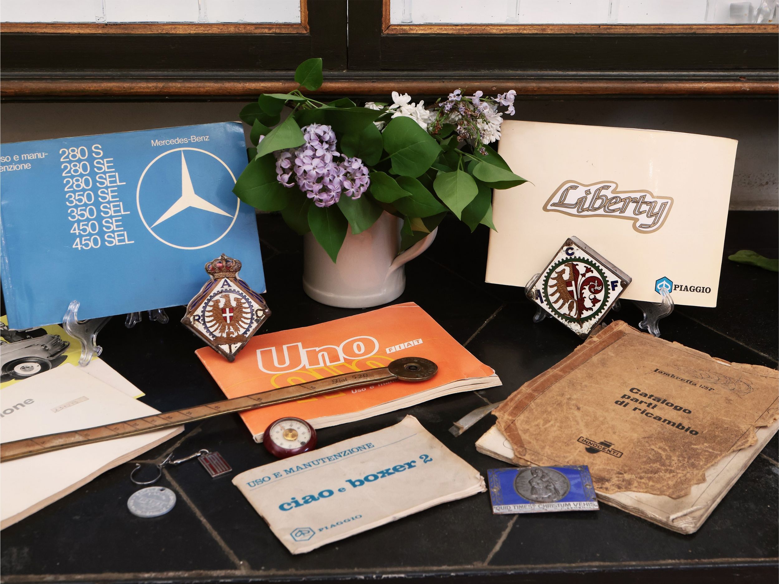 inizio del XX secolo due stemmi in metallo e smalti, uno RACI, difetti, una targhetta da cruscotto con immagine sacra, un misuratore Fiat 520 ed un portachiavi Fiat abbinati ad un orologio da cruscotto e ad una serie di libretti automobilistici (14)