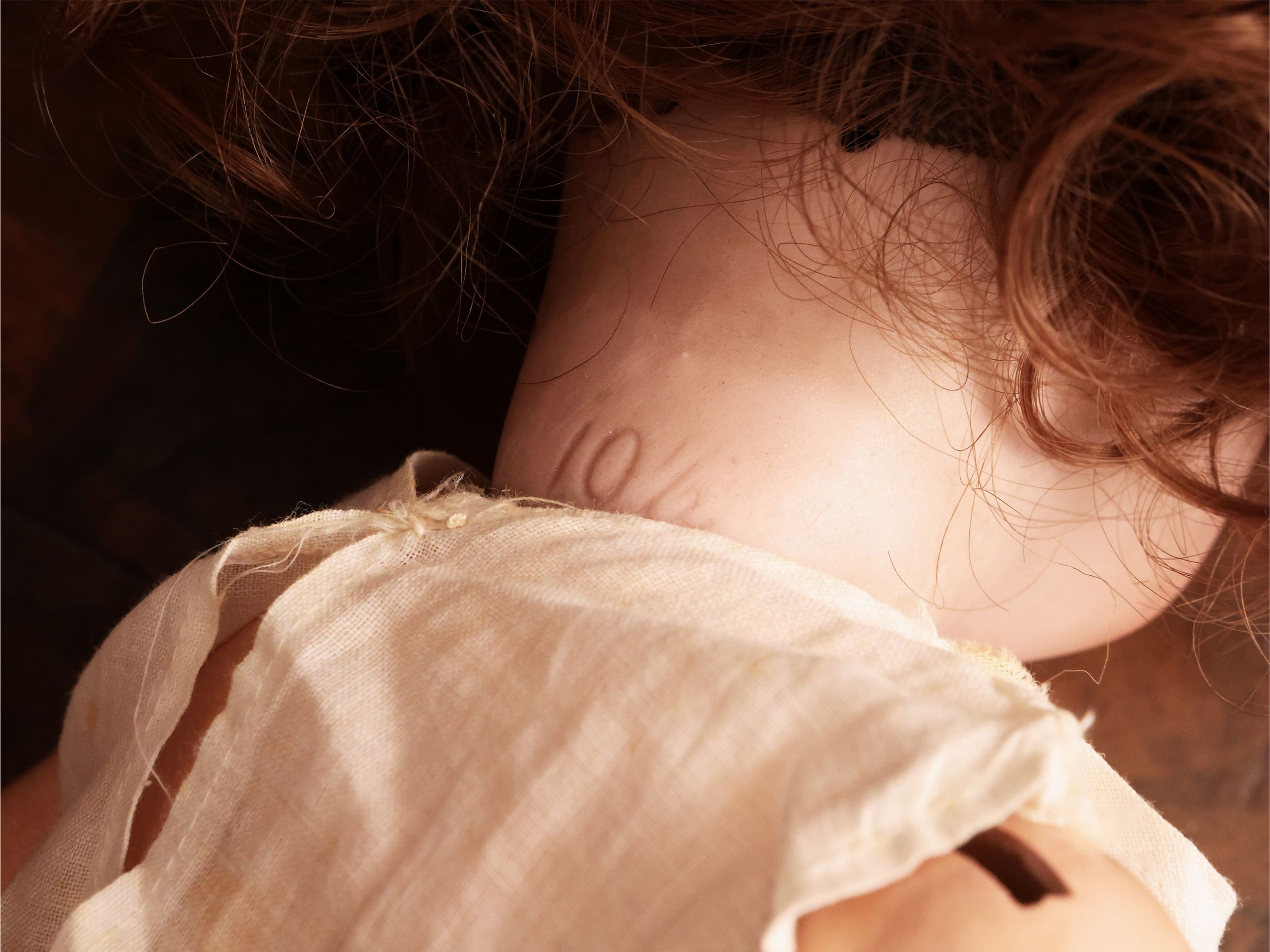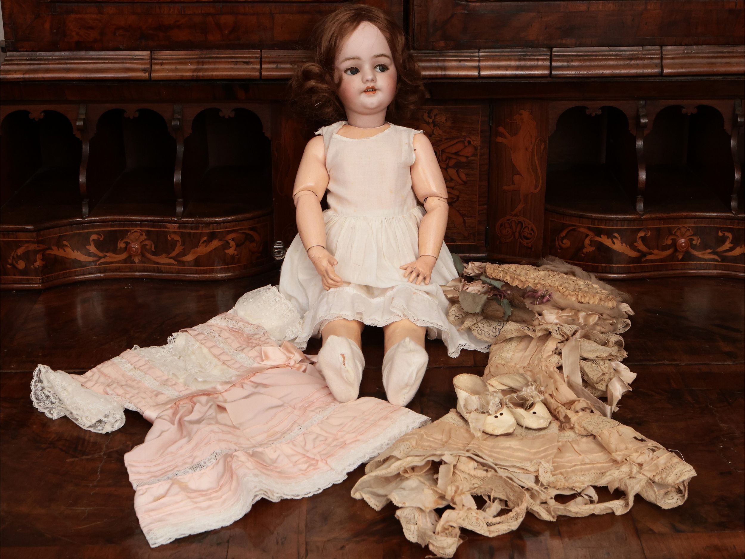 Anni Venti corpo semi-articolato in composizione, movimento meccanico a corda, parrucca di capelli, occhi mobili, bocca con dentini, vestito originale con gravi difetti, altro vestito rifatto su quello originale, cappello e scarpette