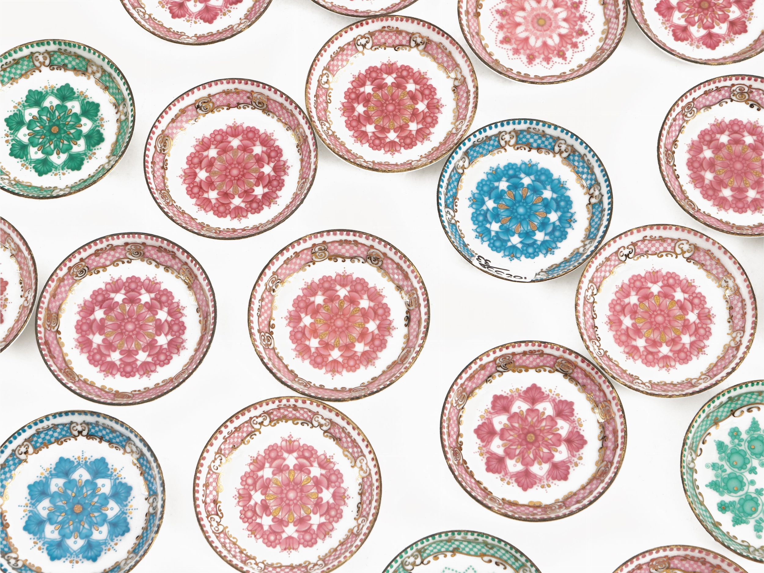 Asutria, XX secolo composto da una serie di 33 piattini dipinti con motivi floreali in monocromia rosa, verde e azzurra e lumeggiature dorate, lievi difetti