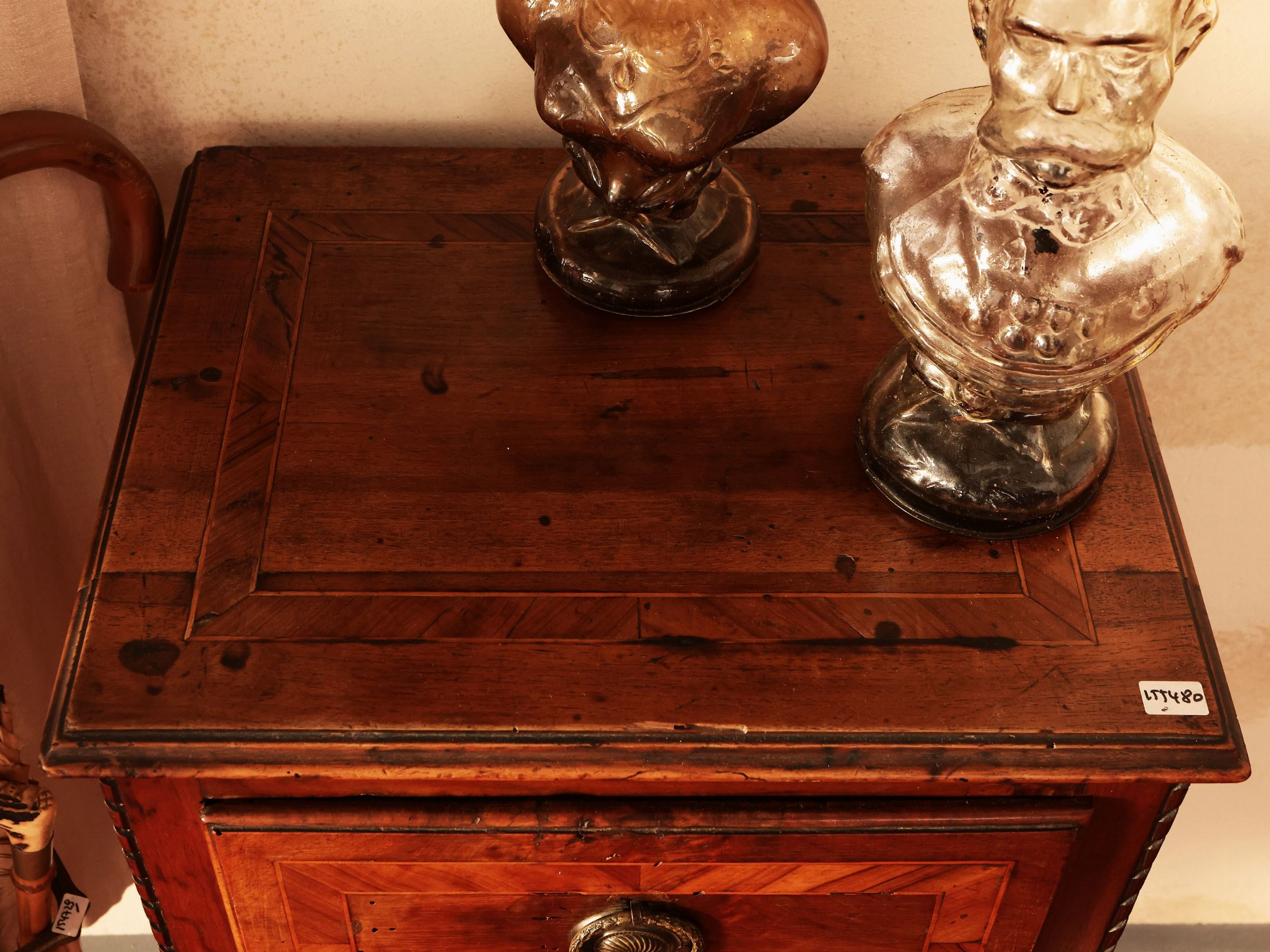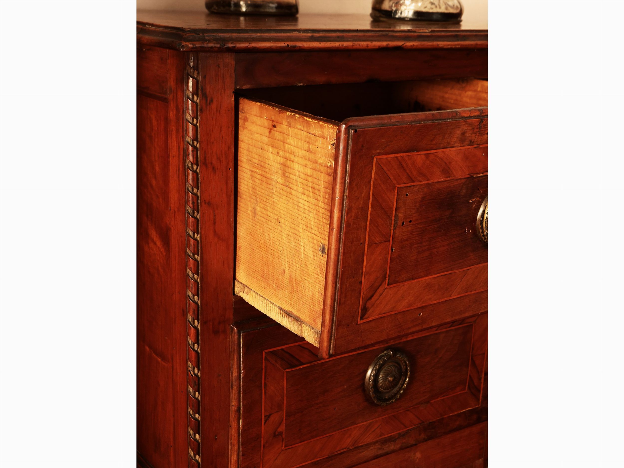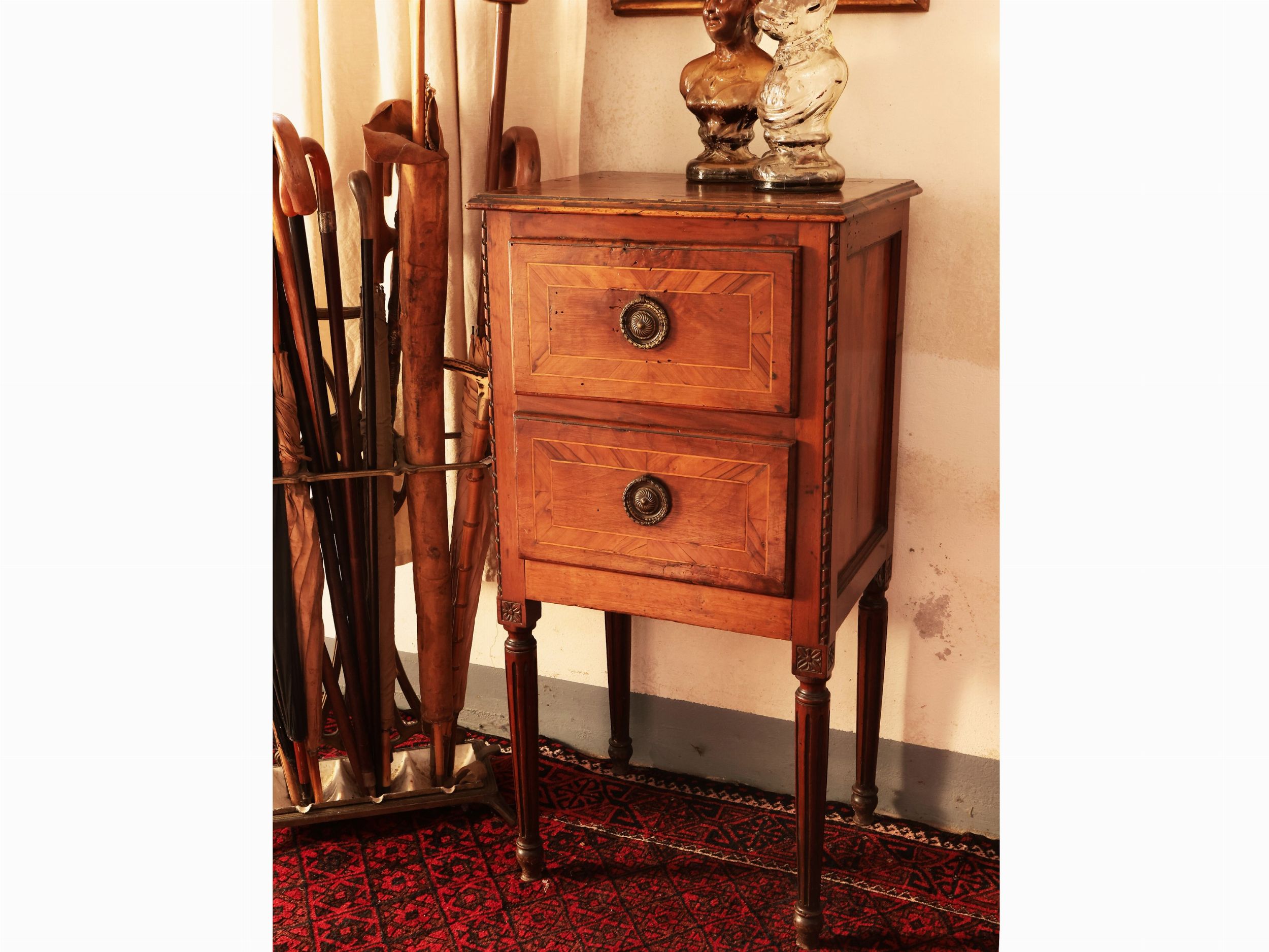 fine del XVIII secolo intarsiato in legni di frutto con filettature, due cassetti sul fronte dritto, angoli intagliati con bordo a nastro arricciato, gambe scanalate con piedini a vaso