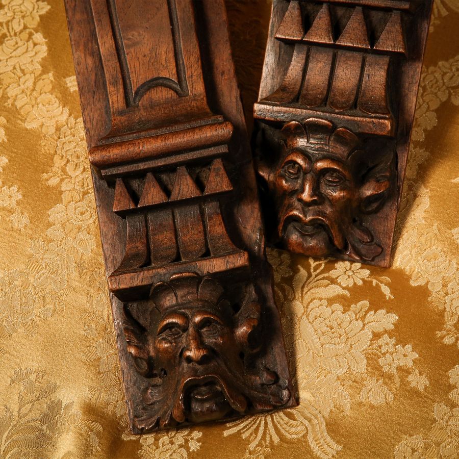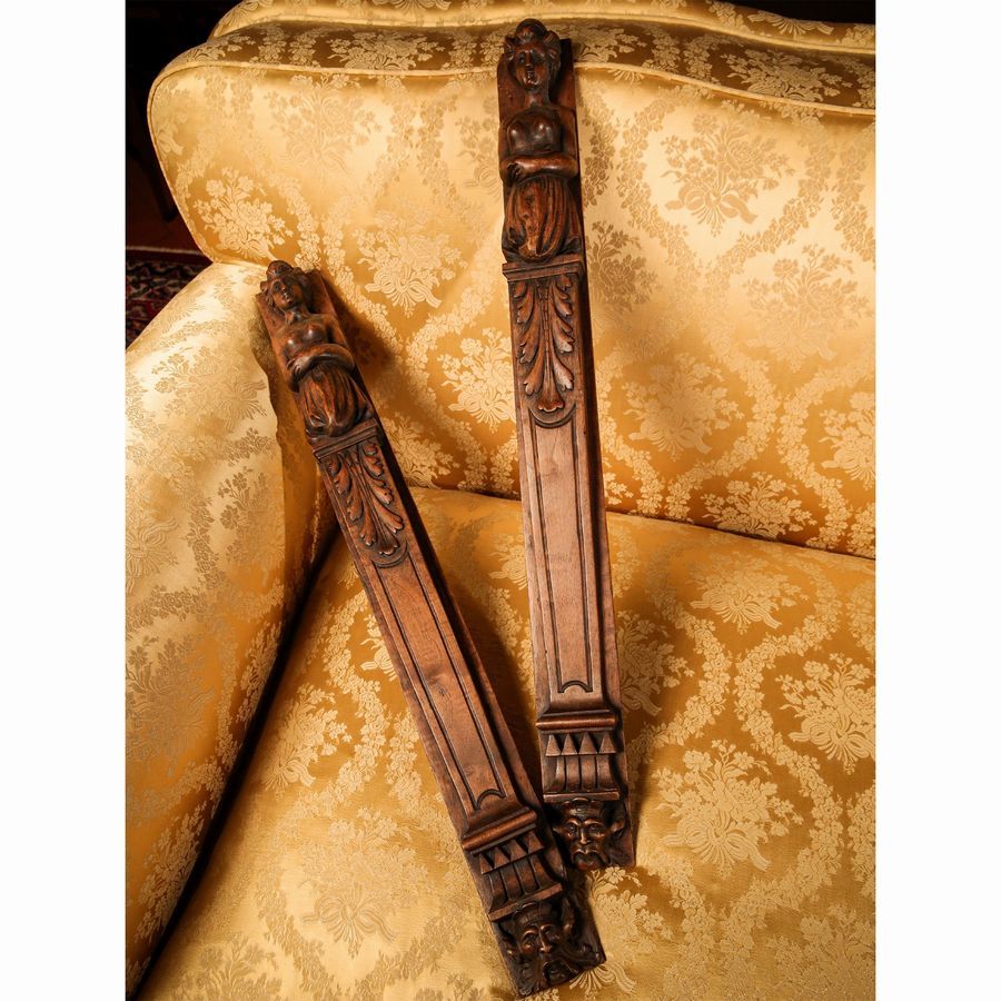Coppia di elementi architettonici per mobilia in noce intagliato
