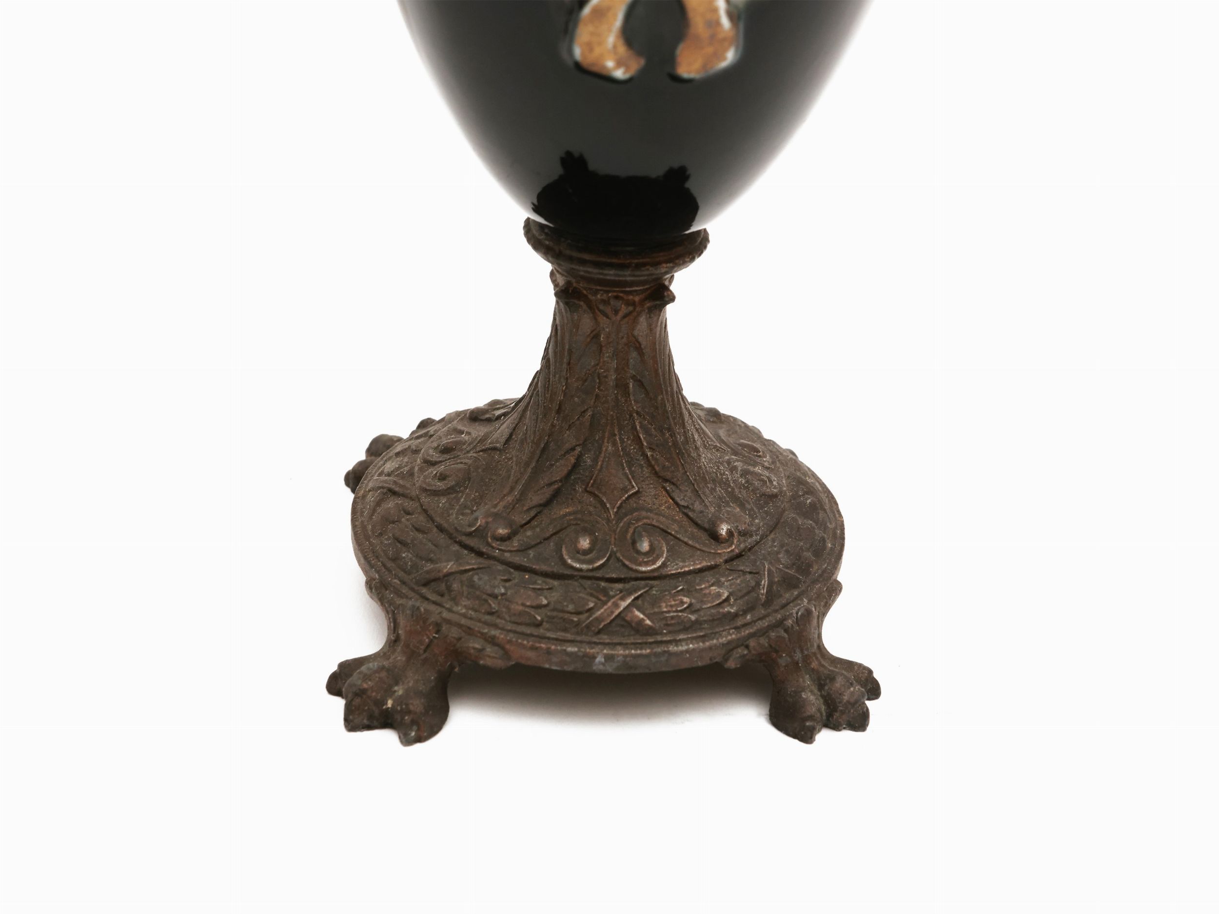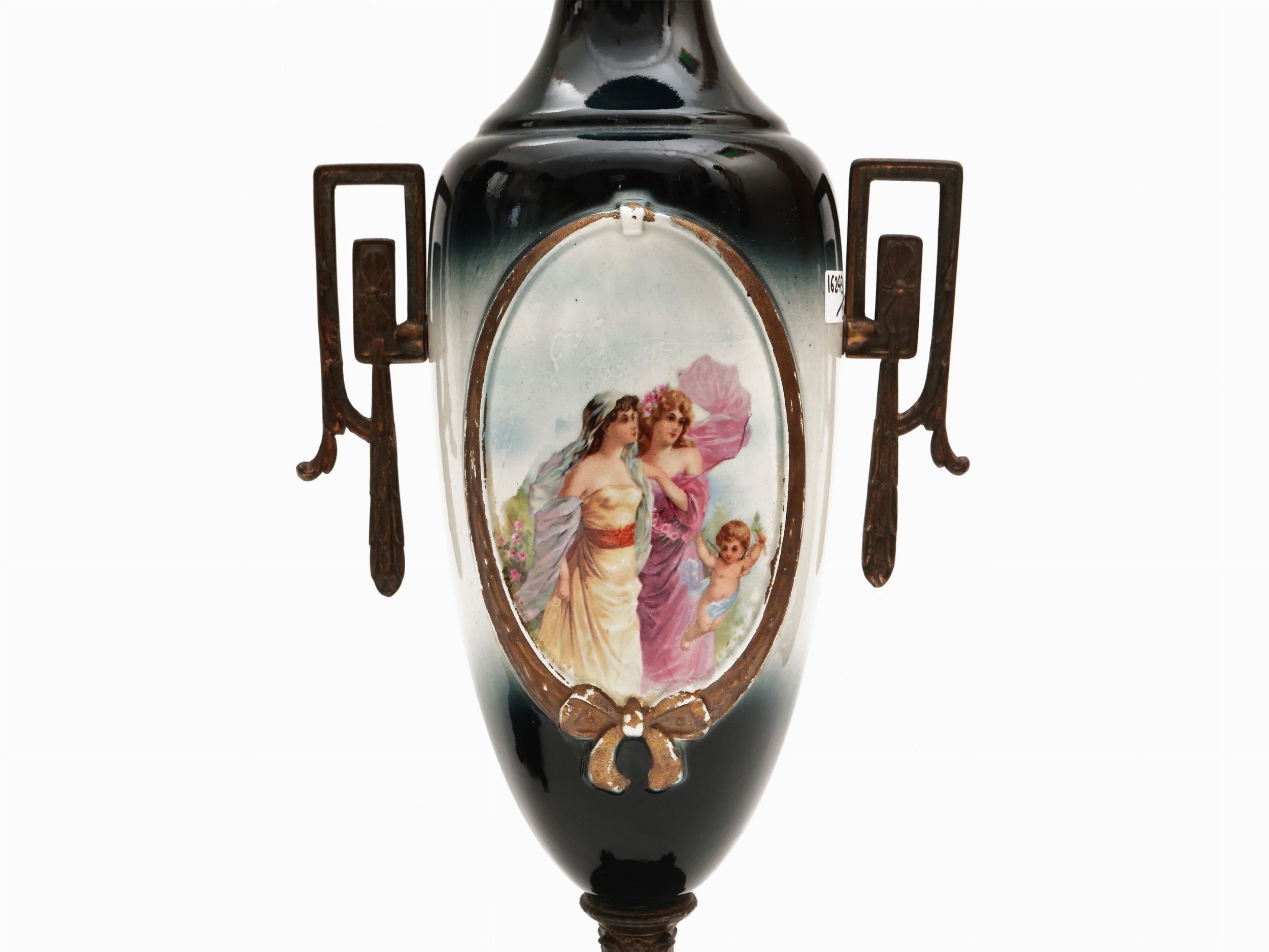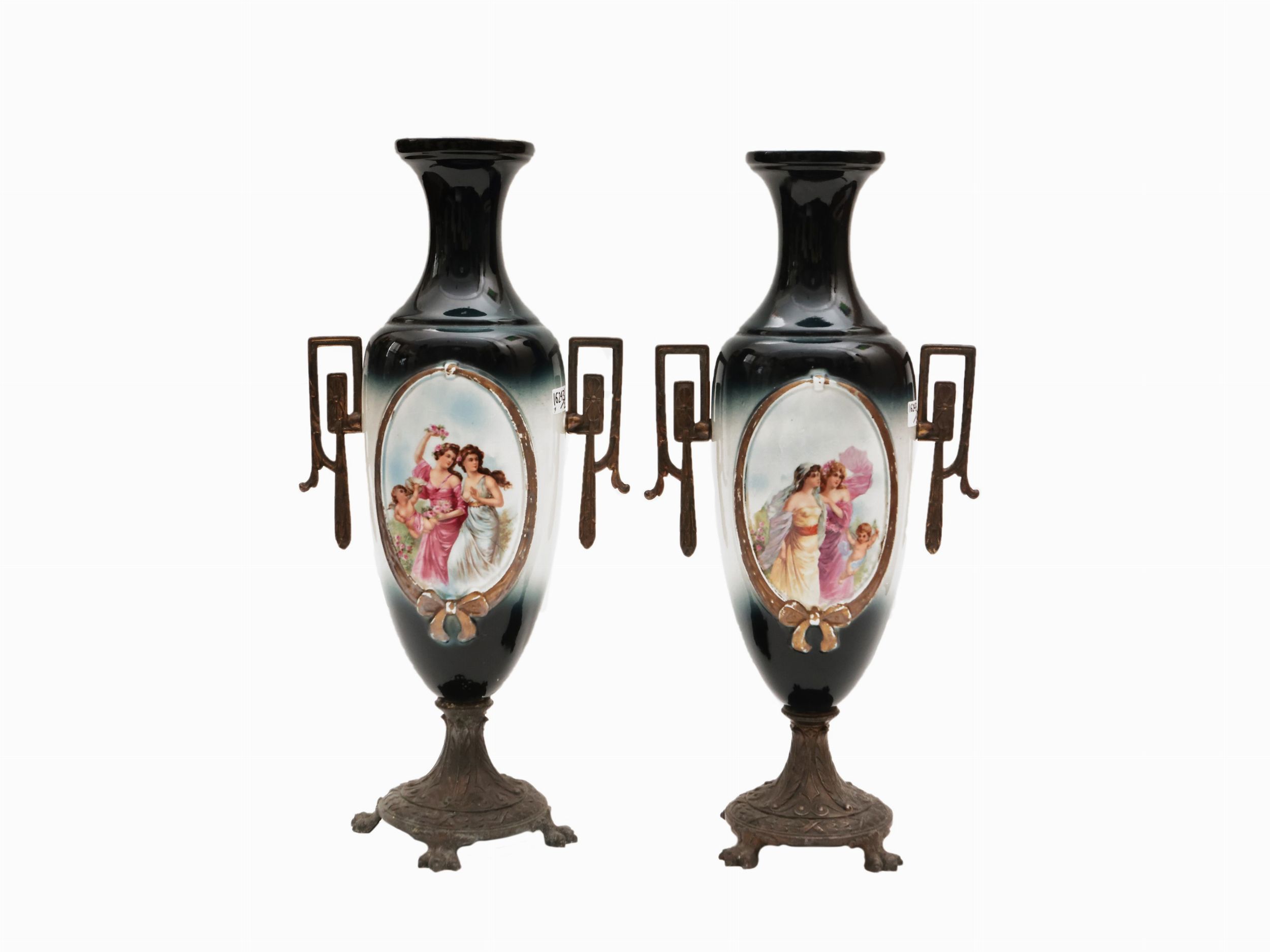 inizio del XX secolo decorati a gradiente nei toni del blu cobalto e del bianco, centrati da figure femminili entro riserve circolari con motivo a nastro lumeggiato in oro, dettagli in metallo brunito, lievi difetti
