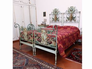 Coppia di letti in ferro battuto laccato verde acqua e dipinto