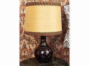 h cm 40-73 Cina dipinto in oro su fondo blu, montato a lume, corredato di paralume color corda con dettagli in [..]