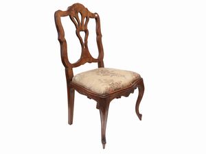 h cm 89x46x42 XVIII/XIX secolo schienale sagomato con cartella traforata, pendaglina intagliata e centrata con [..]