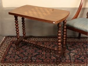 h cm 66x78x41 XIX/XX secolo piano intarsiato con motivo a scacchiera, gambe tornite riunite da traversa ad H, [..]