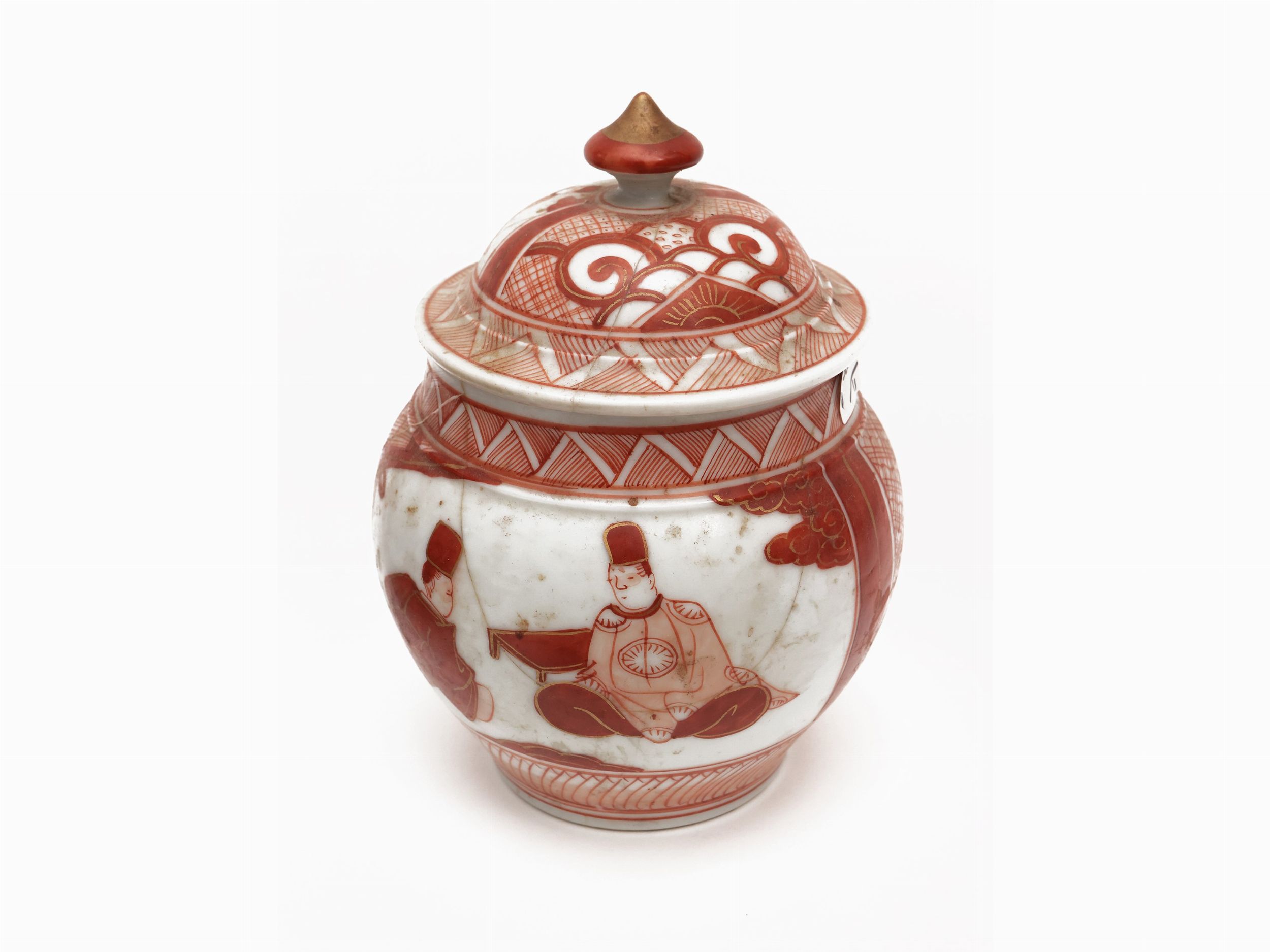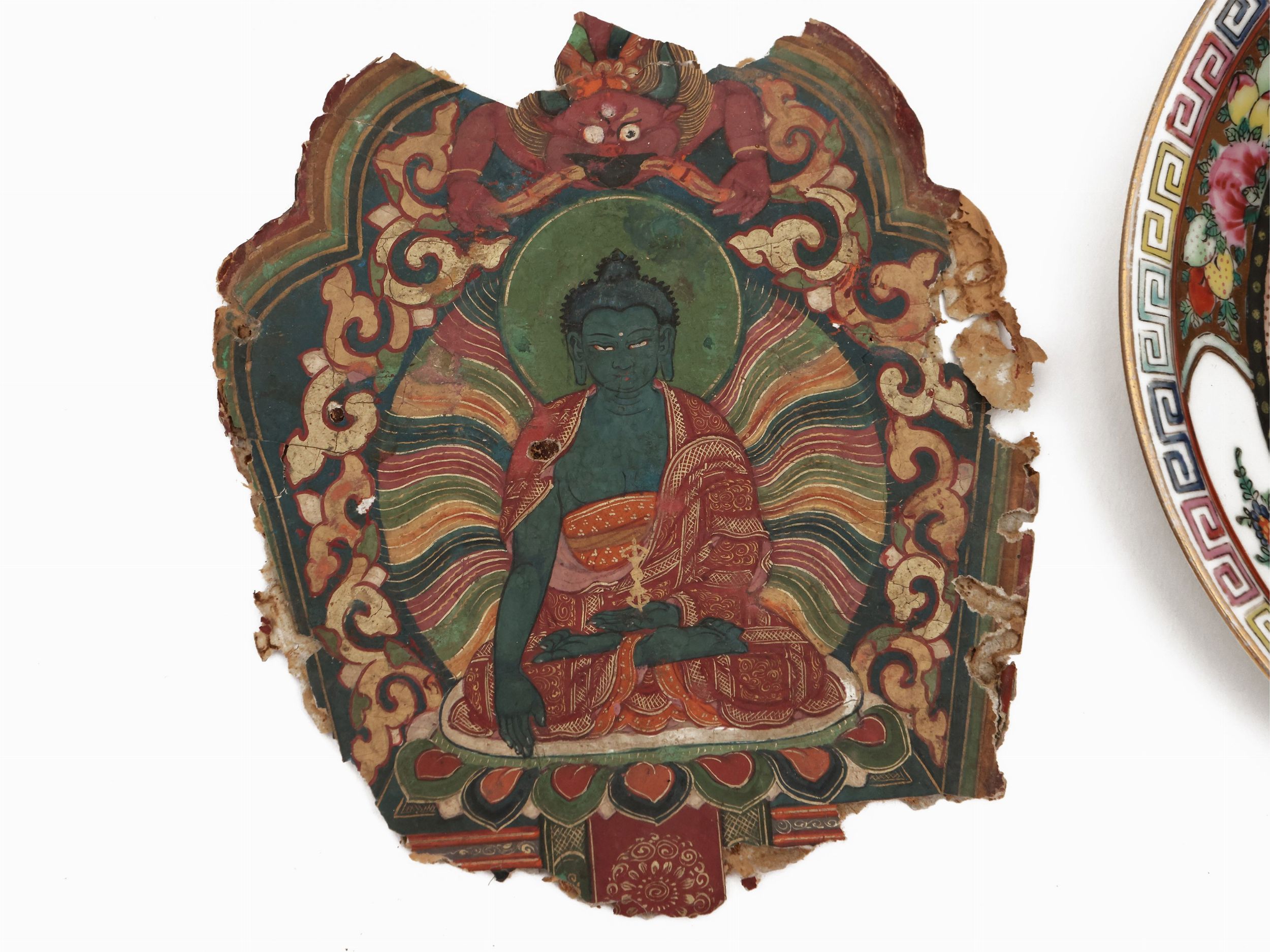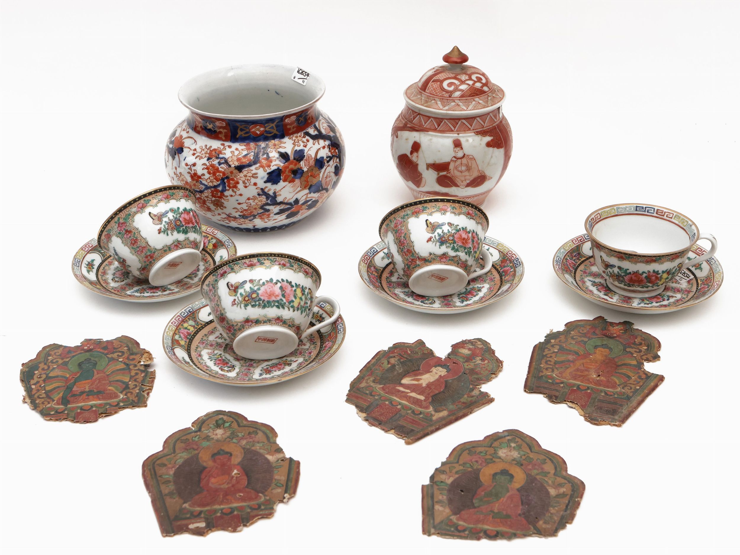 h da cm 13 a cm 17 (11) XIX/XX secolo tra cui alcuni frammenti di festoni sacri raffiguranti i 5 Buddha o 5 conquistatori, realizzati a tecnica mista su carta, un vaso a potiche dipinto con scena di genere in monocromia rossa ed un serie di 4 tazze da tè in porcellana dipinte in policromia con fiori e volatili e lumeggiate in oro, corredate da piattino, difetti e restauri